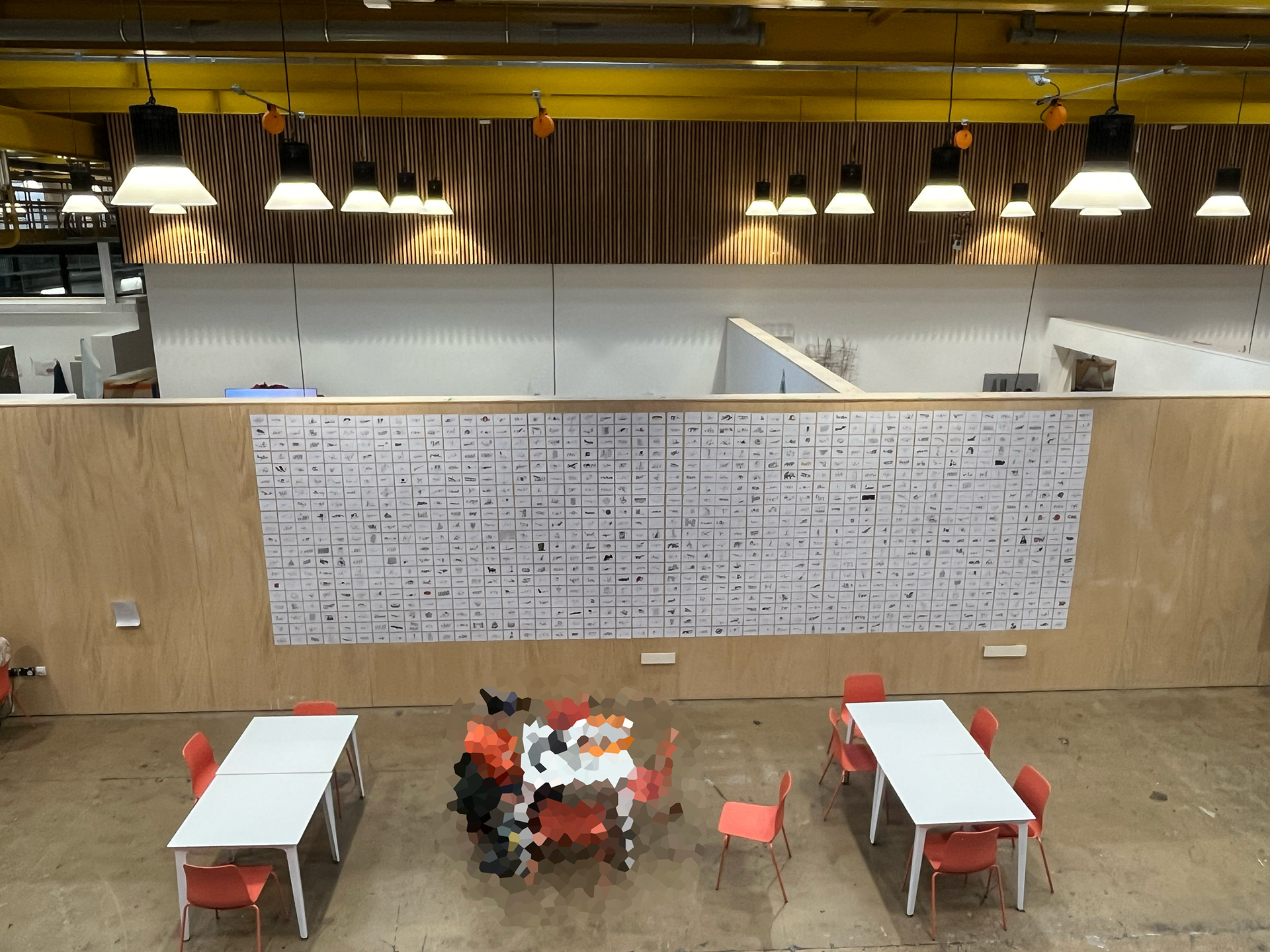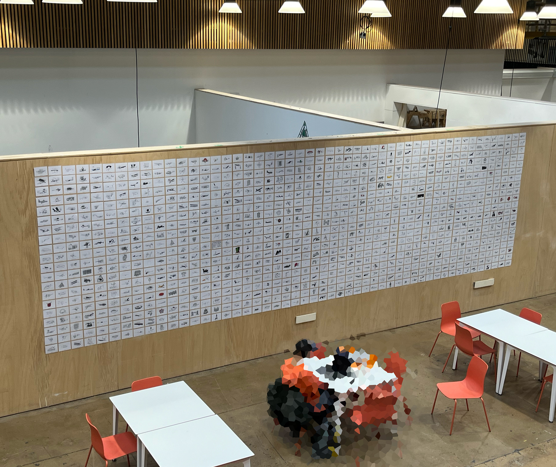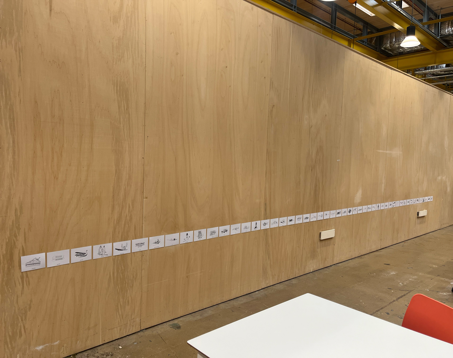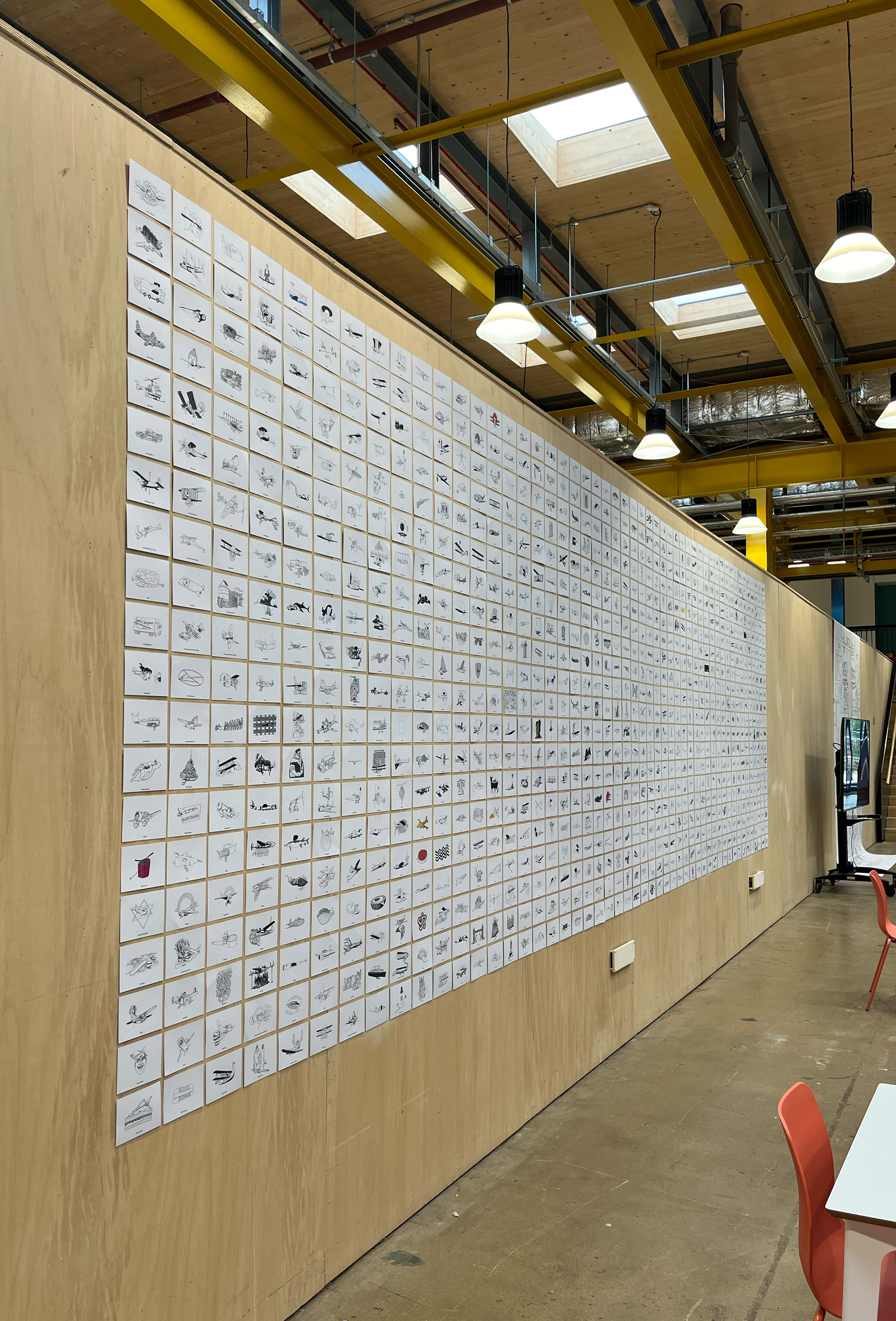 The entire set of drawings were exhibited in The Street and Bath Spa University's Locksbrook Road campus from 30th September until 11th October 2024. The drawings were printed on A6 postcards in a 50 x 20 grid measuring 8 x 2.5 metres. After the exhibition, I sold the original drawings and sent the money, around £270 to the charity Warchild. Thanks if you bought a drawing.