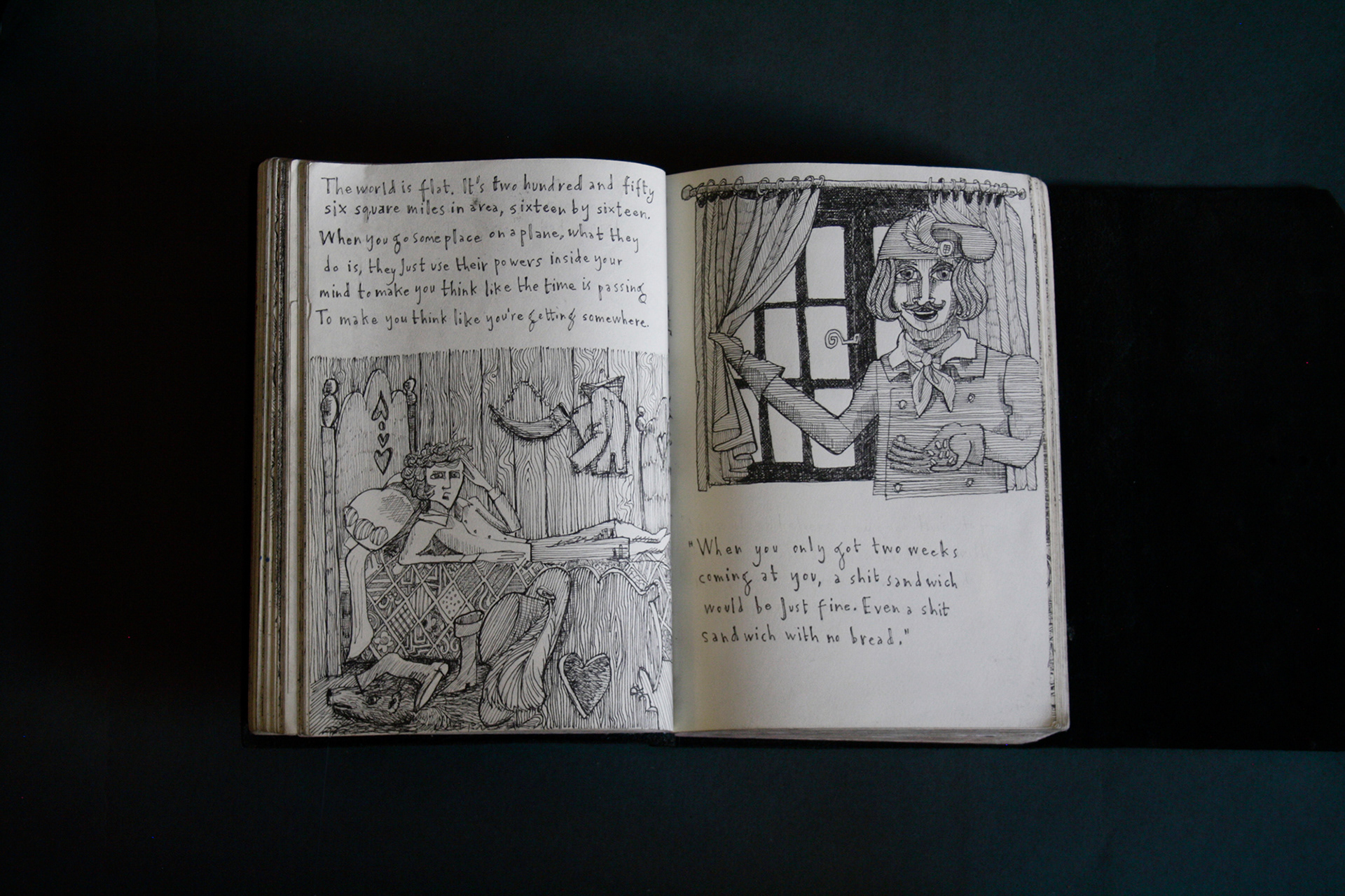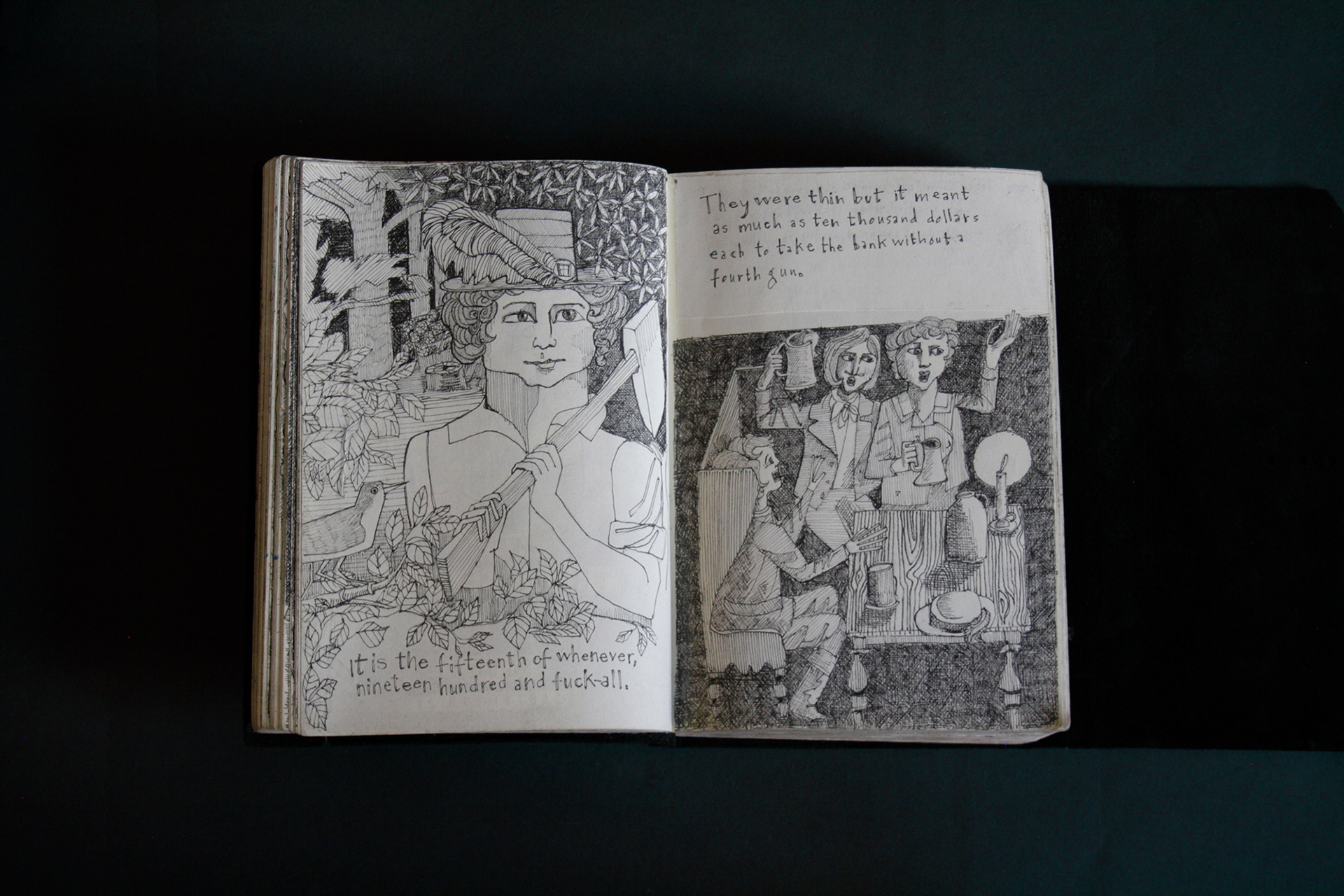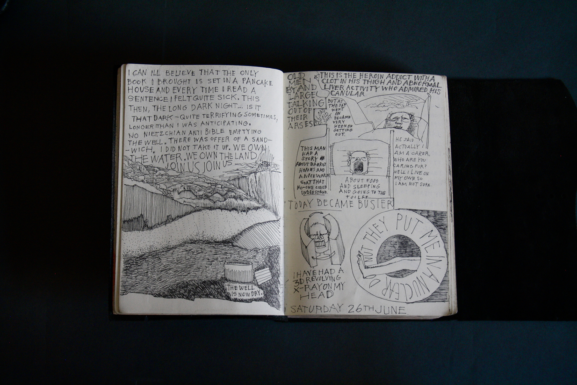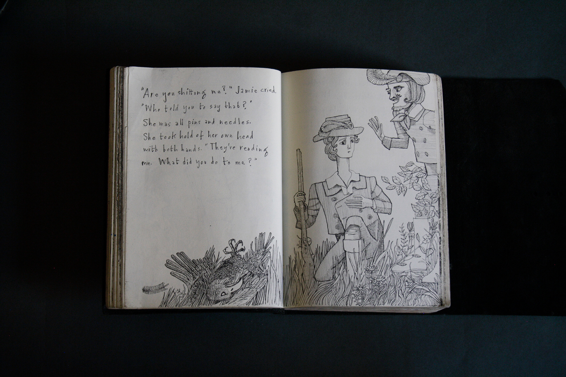 This book is therefore, somewhat gloomy in places. The first section, where all the unpleasant stuff happens is solely in black and white. Then there is a spell where I was blank. I remember reading Denis Johnson's Fiskadoro and thinking, oh, I'll draw a clarinet, but I could barely be bothered. Then I signed up to study a BA in Creative Arts Practice at Bath Spa University and my mood improved. Inverse to my earnings.