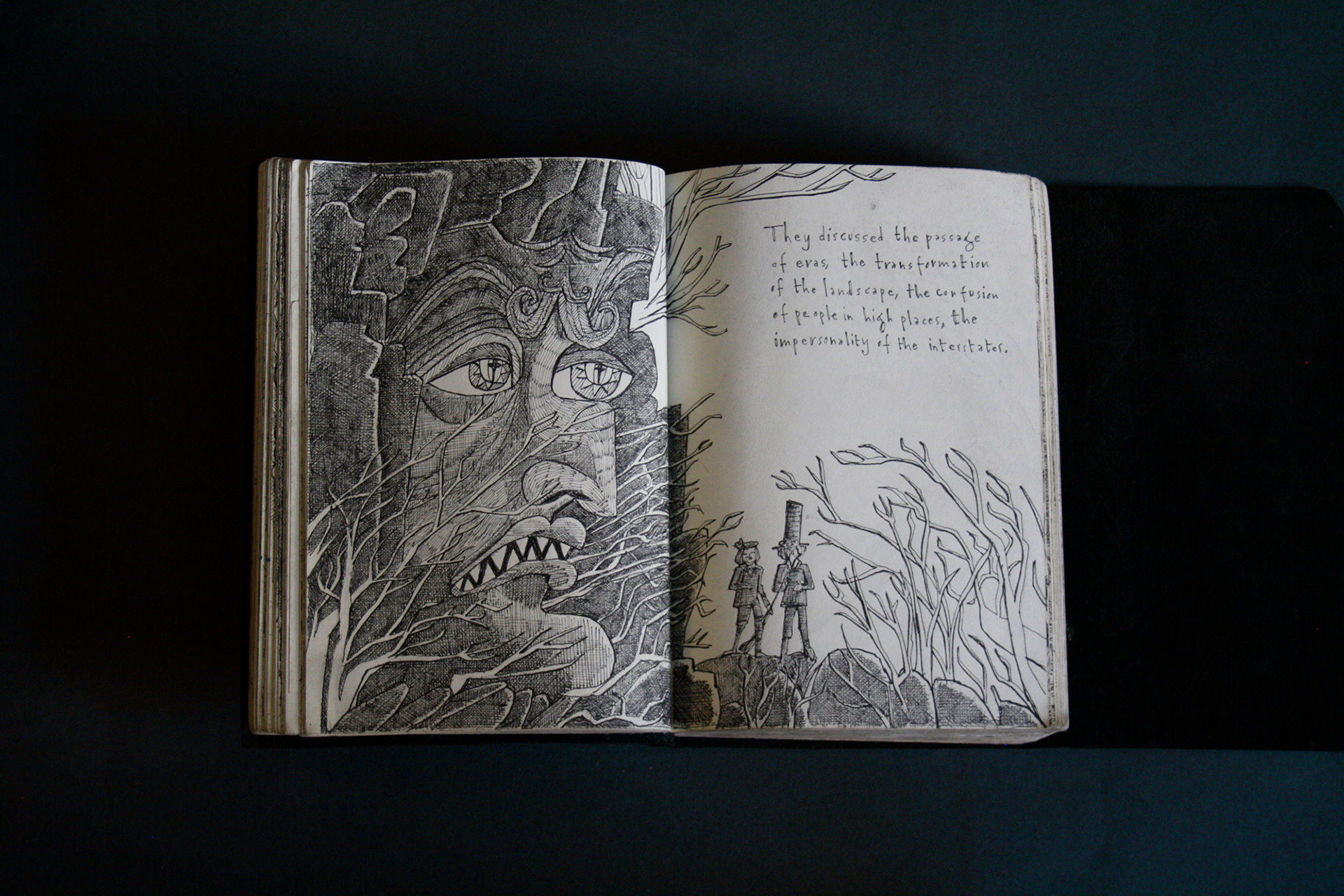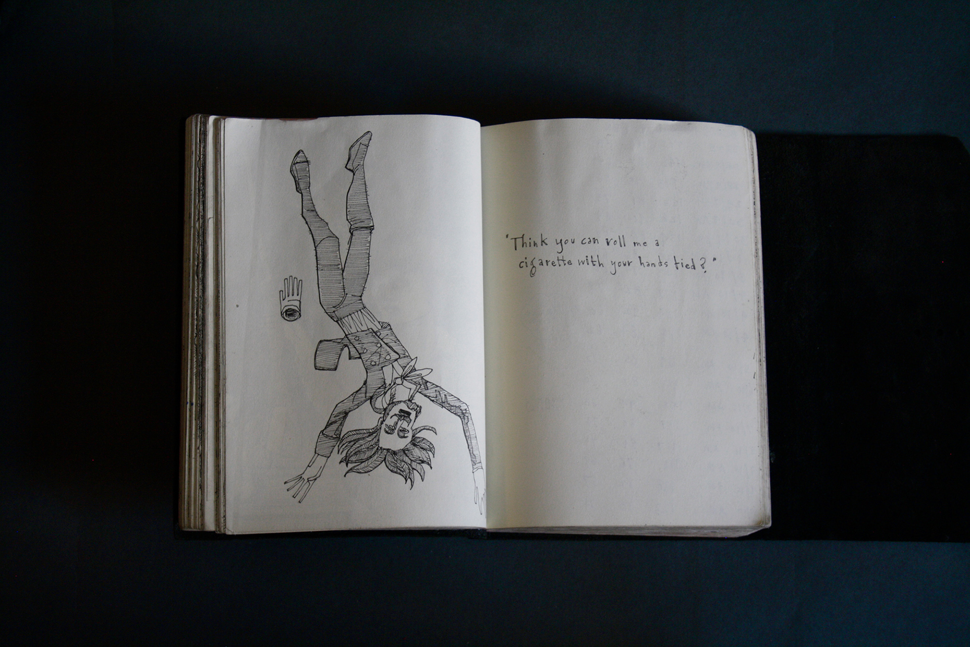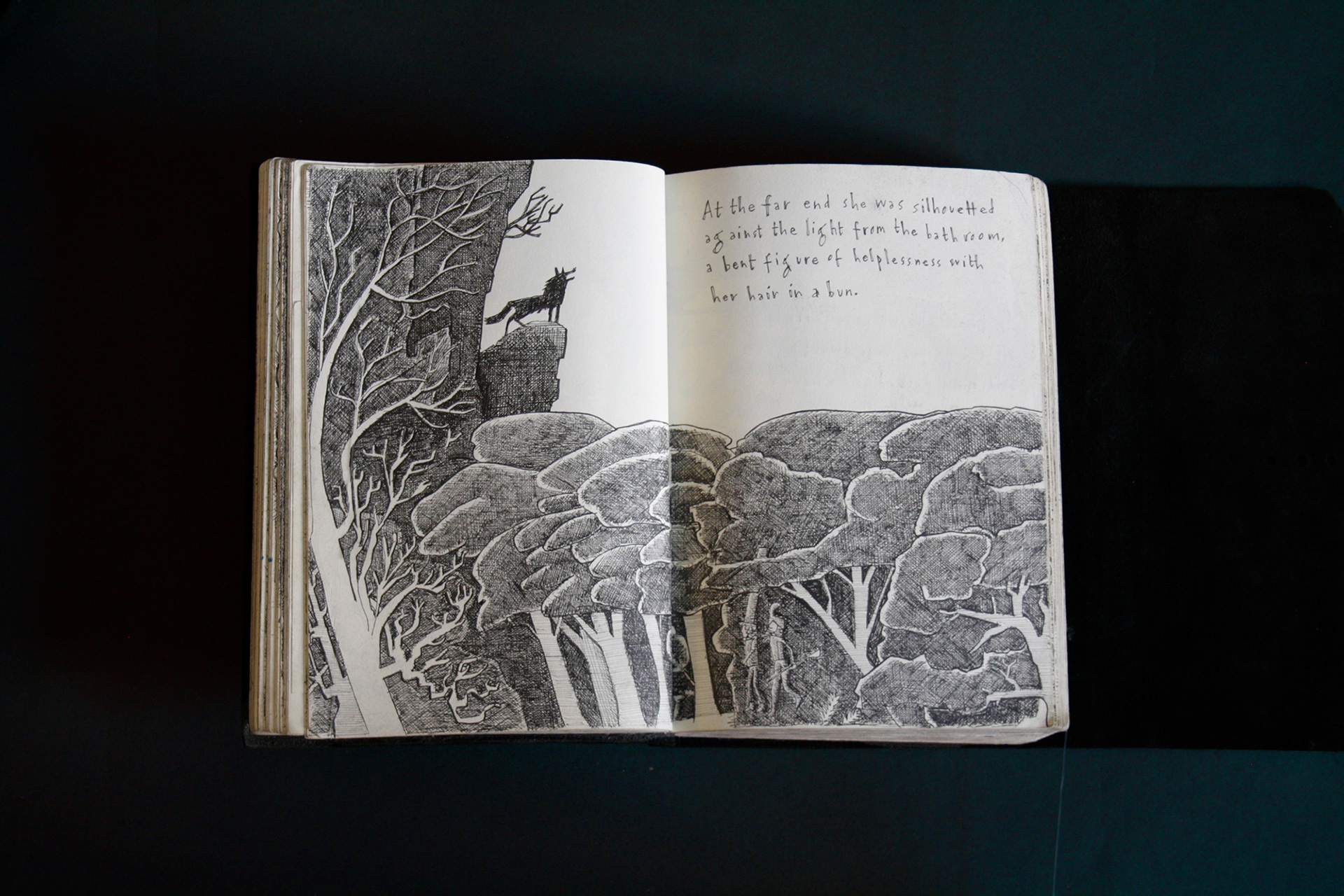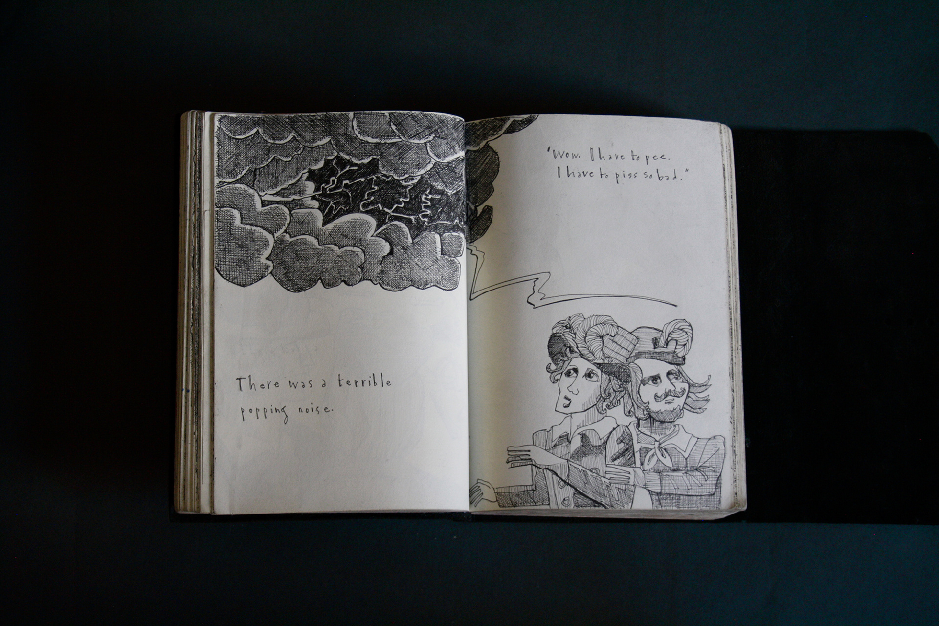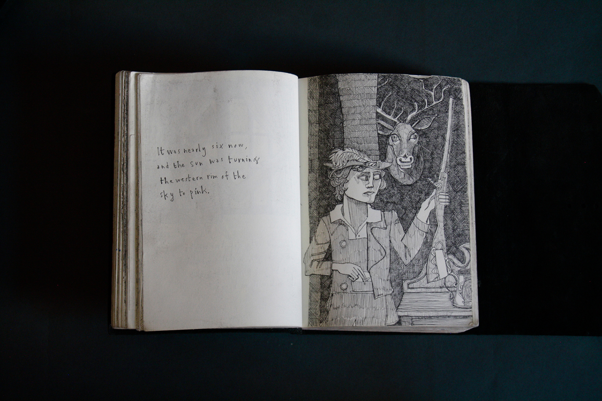 This book is therefore, somewhat gloomy in places. The first section, where all the unpleasant stuff happens is solely in black and white. Then there is a spell where I was blank. I remember reading Denis Johnson's Fiskadoro and thinking, oh, I'll draw a clarinet, but I could barely be bothered. Then I signed up to study a BA in Creative Arts Practice at Bath Spa University and my mood improved. Inverse to my earnings.