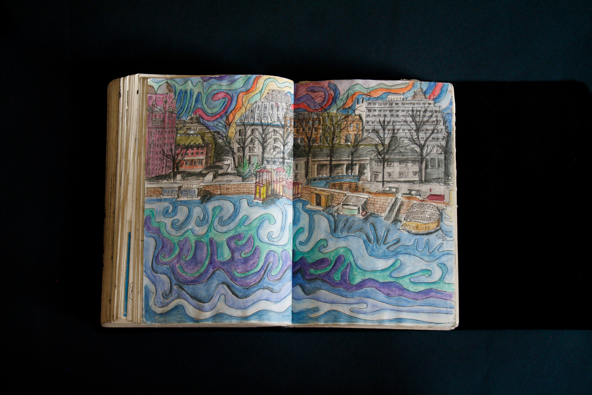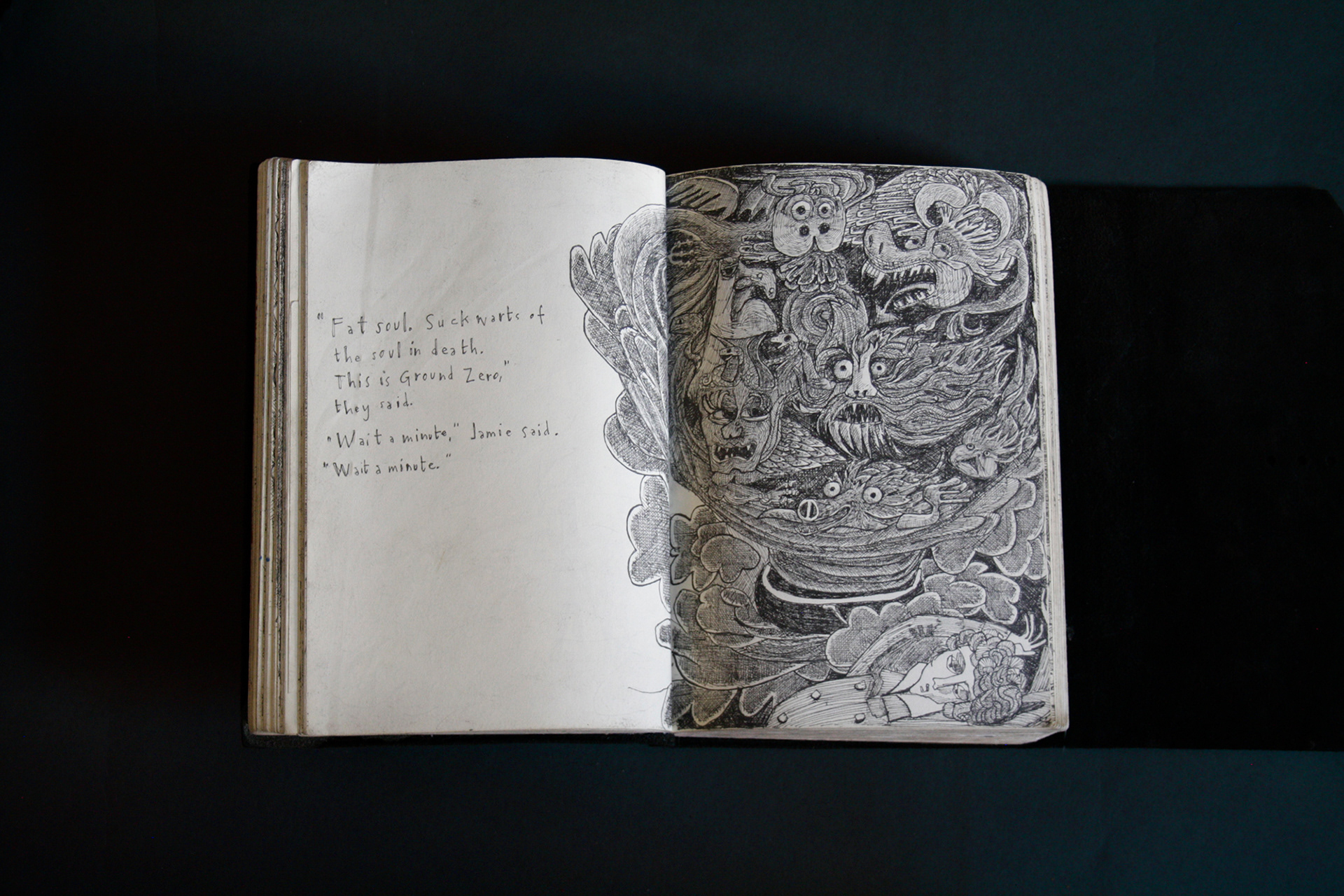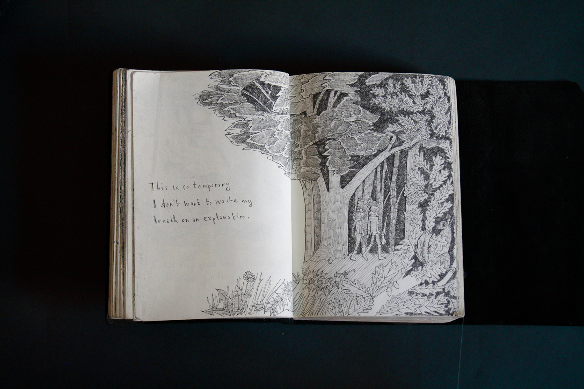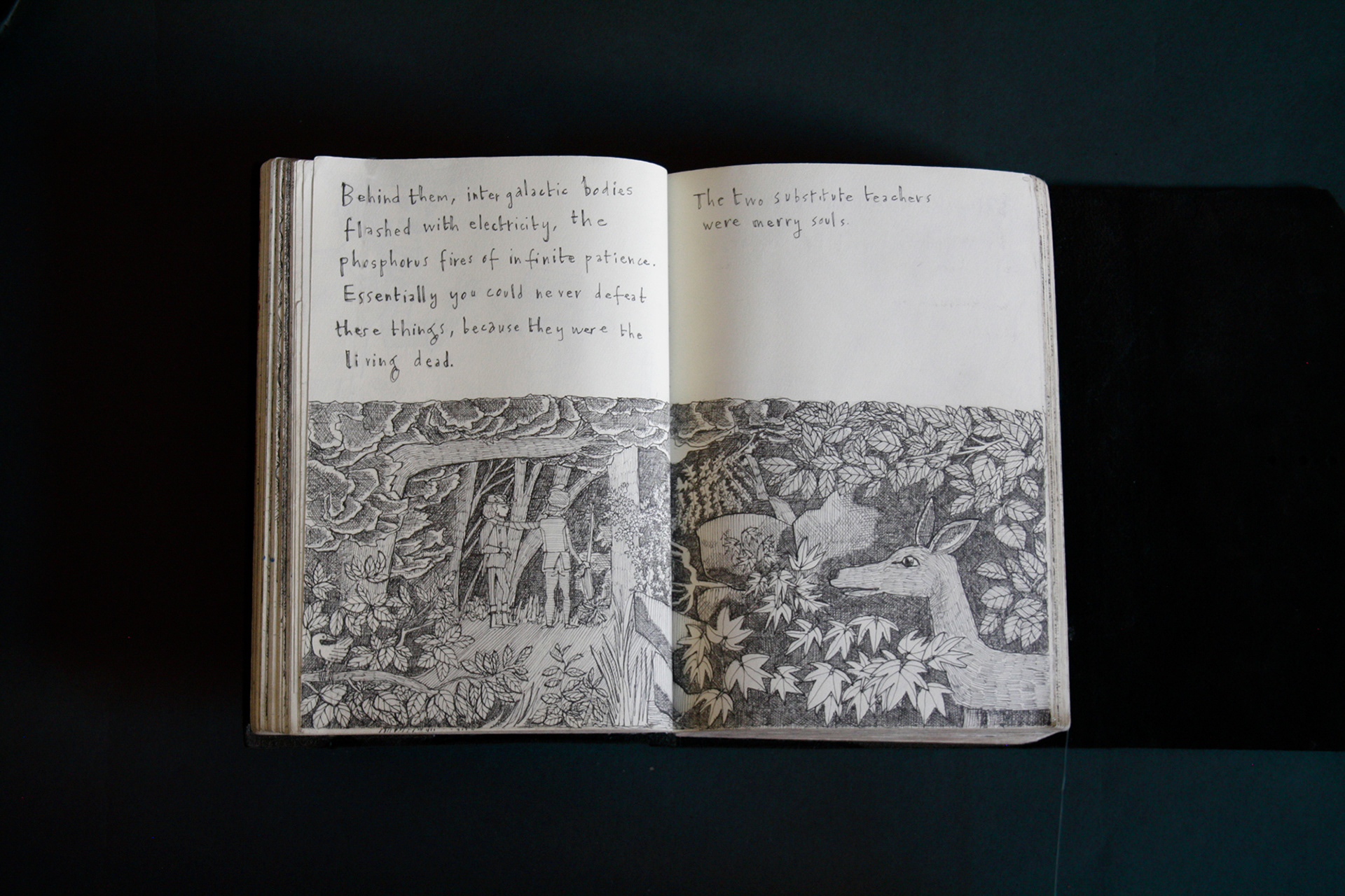 This book is therefore, somewhat gloomy in places. The first section, where all the unpleasant stuff happens is solely in black and white. Then there is a spell where I was blank. I remember reading Denis Johnson's Fiskadoro and thinking, oh, I'll draw a clarinet, but I could barely be bothered. Then I signed up to study a BA in Creative Arts Practice at Bath Spa University and my mood improved. Inverse to my earnings.