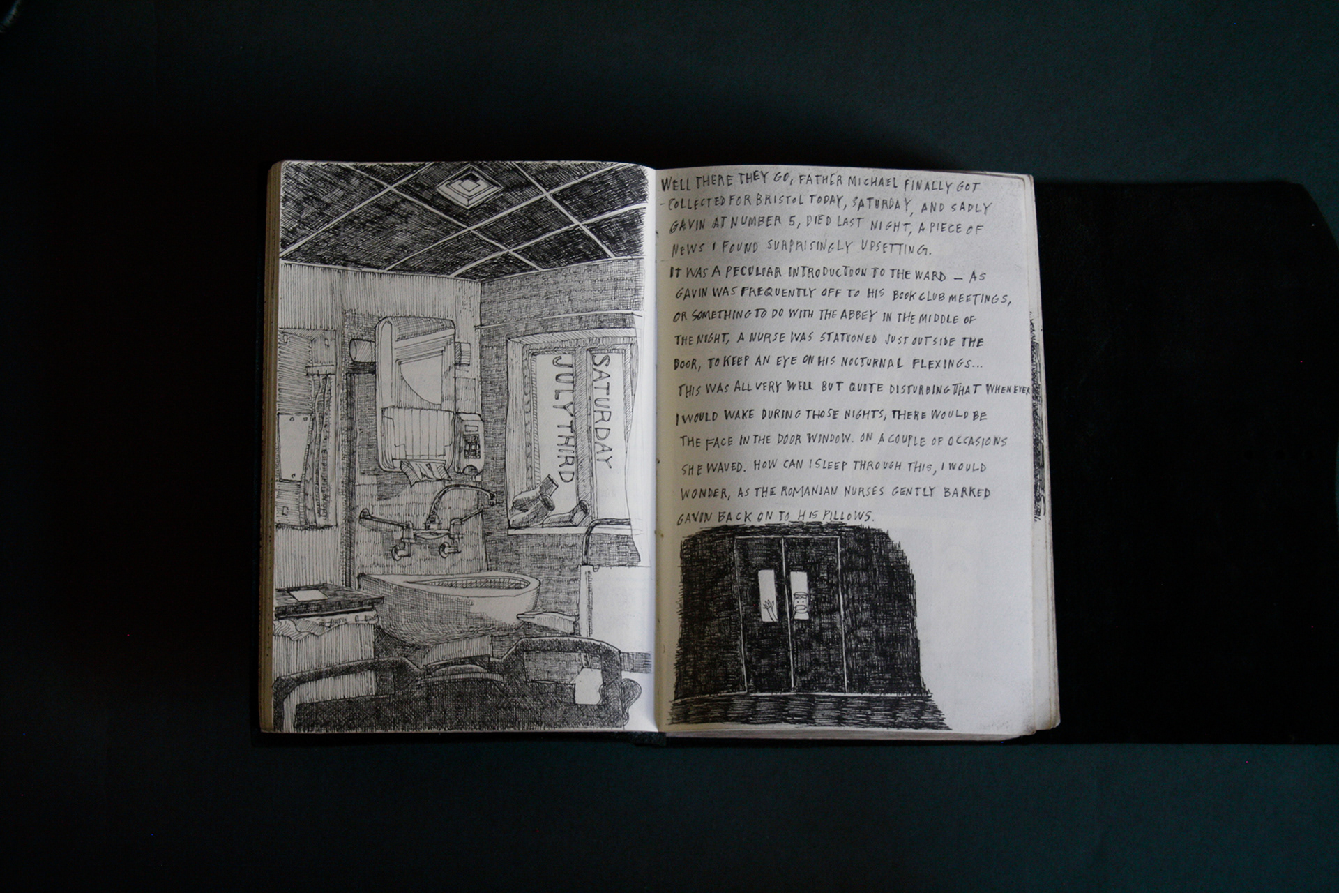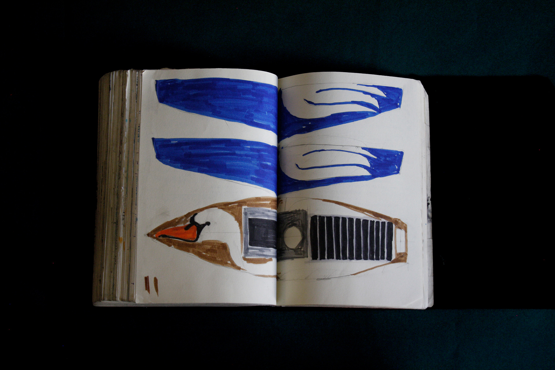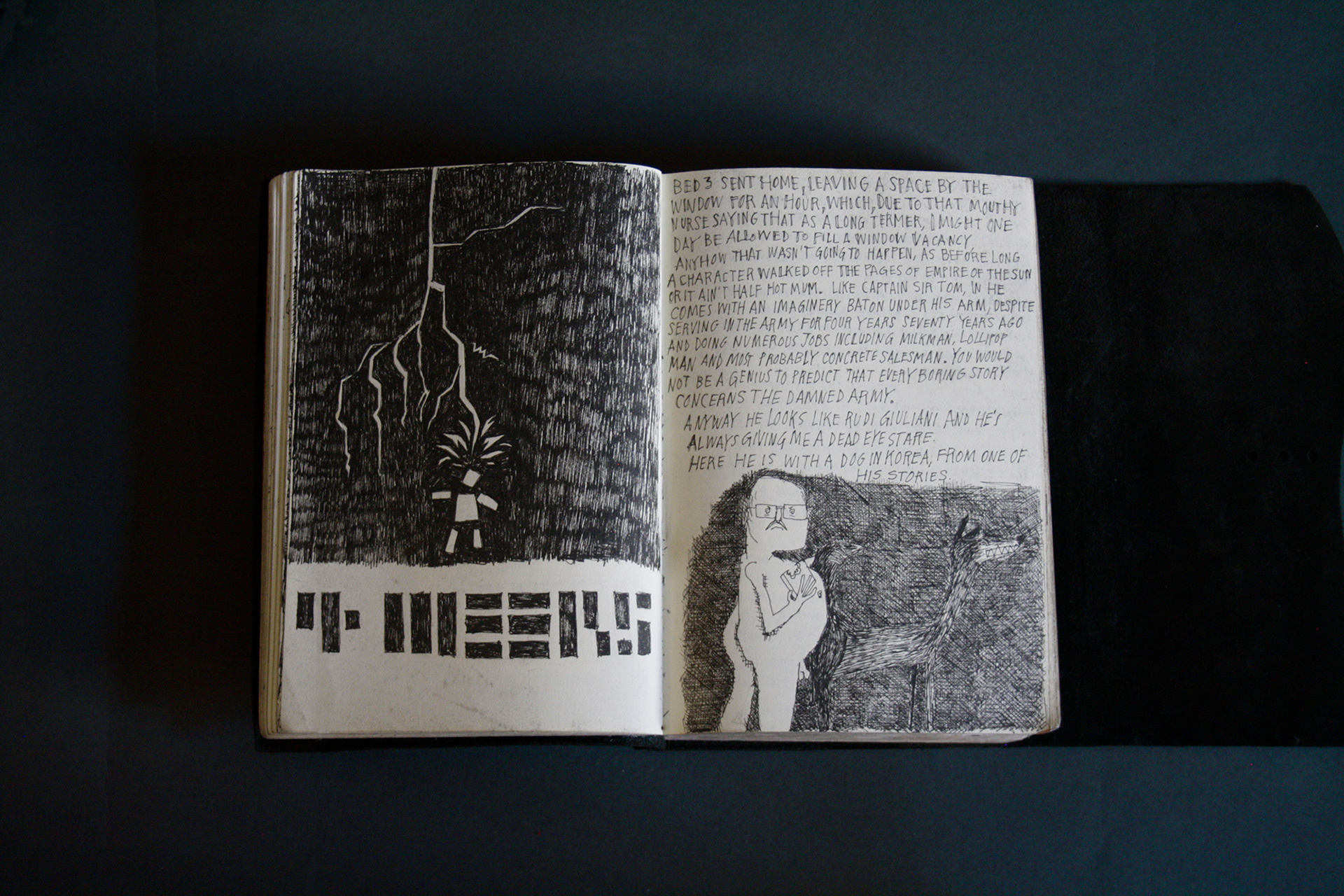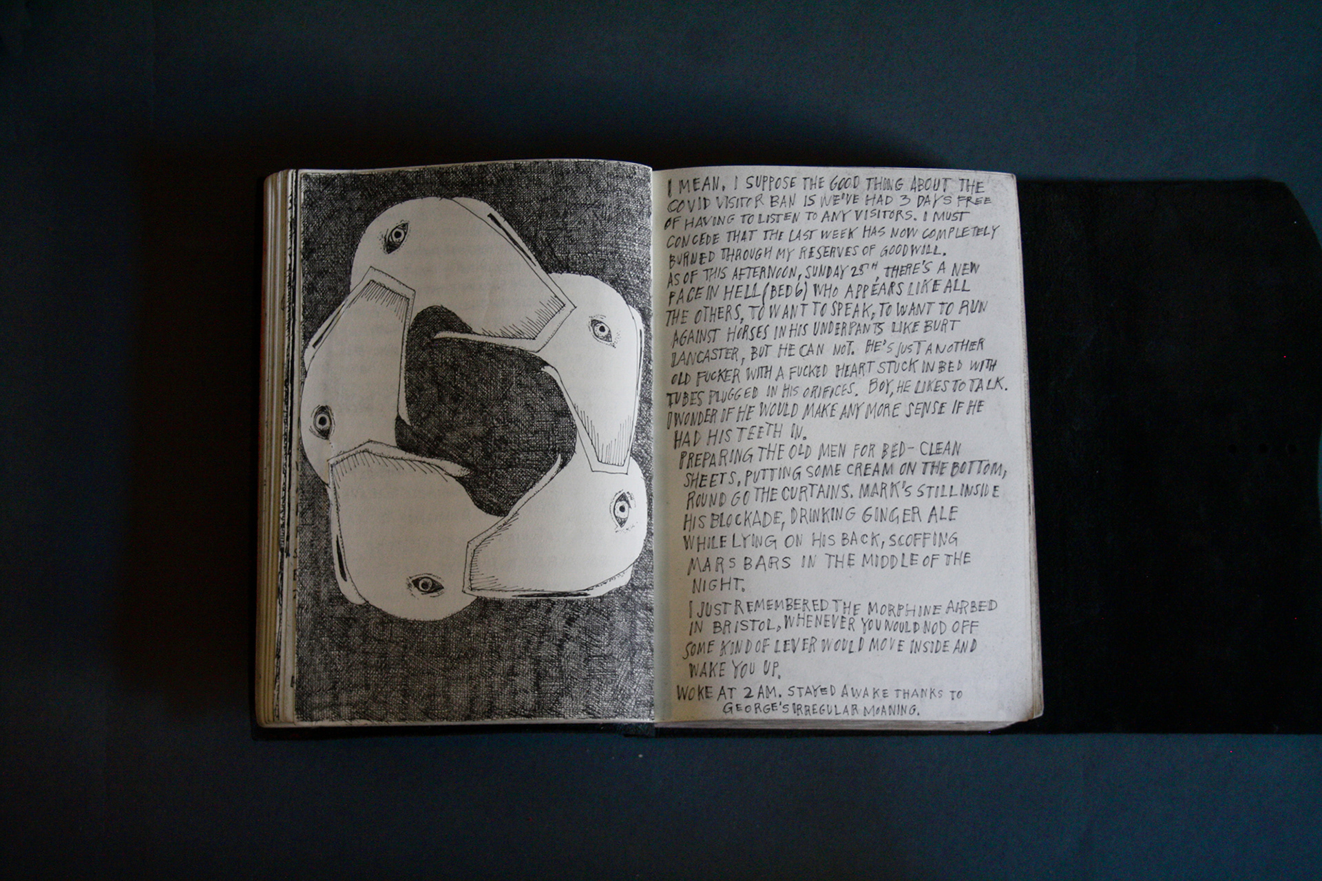 On the first page of the third black book, it states it was begun on the 3rd February 2021. This was the beginning of a difficult time. My mother had been diagnosed with cancer. I was hospitalised with heart disease. Then my mother died. Then I was hospitalised again with septic shock and a giant elbow. So this book is somewhat gloomy in places. The first section, where all the unpleasant stuff happens is solely in black and white. Then there is a spell where I was pretty blank. I look at the 2 spreads with the clarinet and remember that I had no idea where to go. Then I signed up to study a BA in Creative Arts Practise at Bath Spa University and travelled a bit and things got it little better. Book 4 is currently in progress.