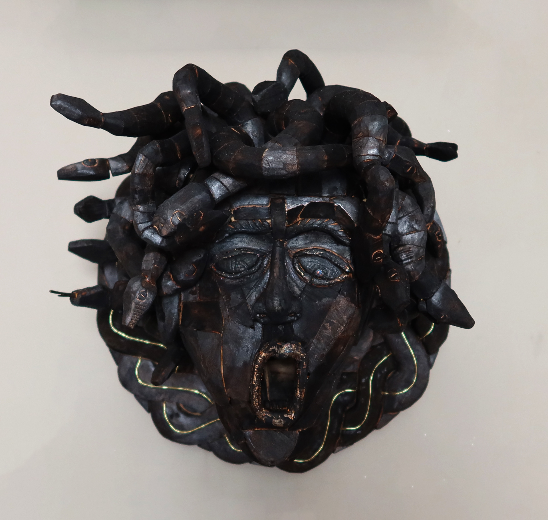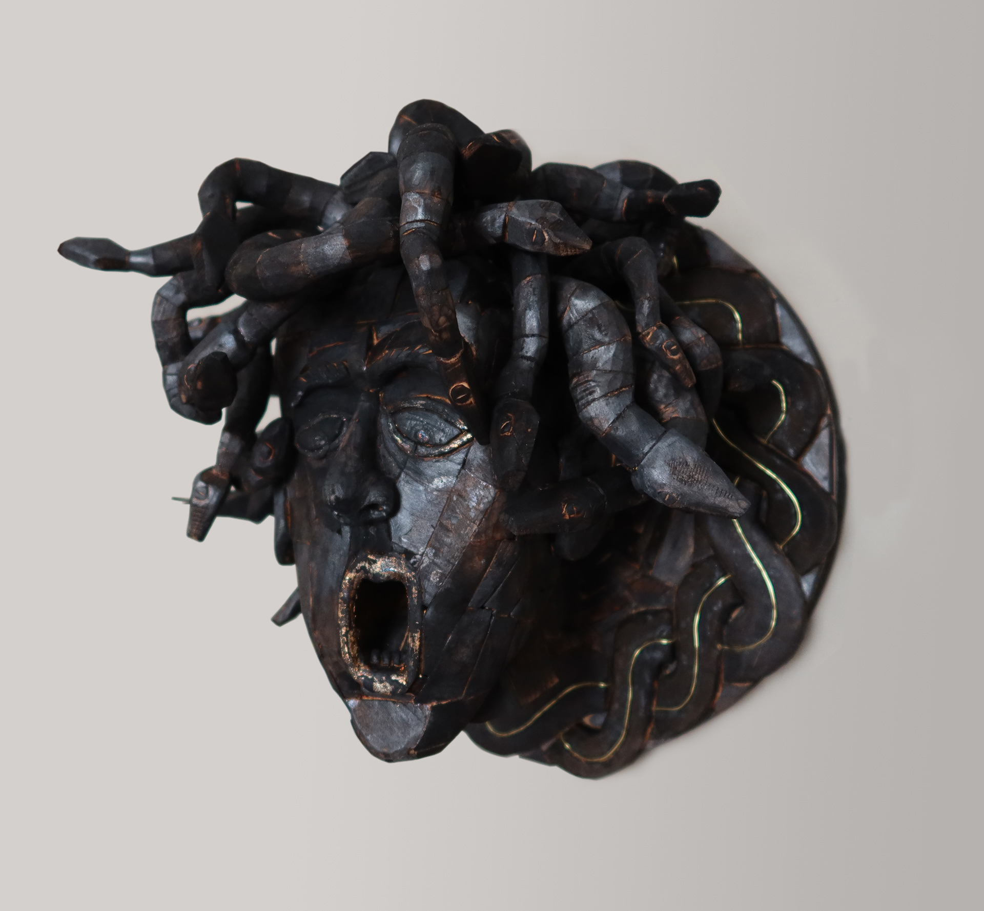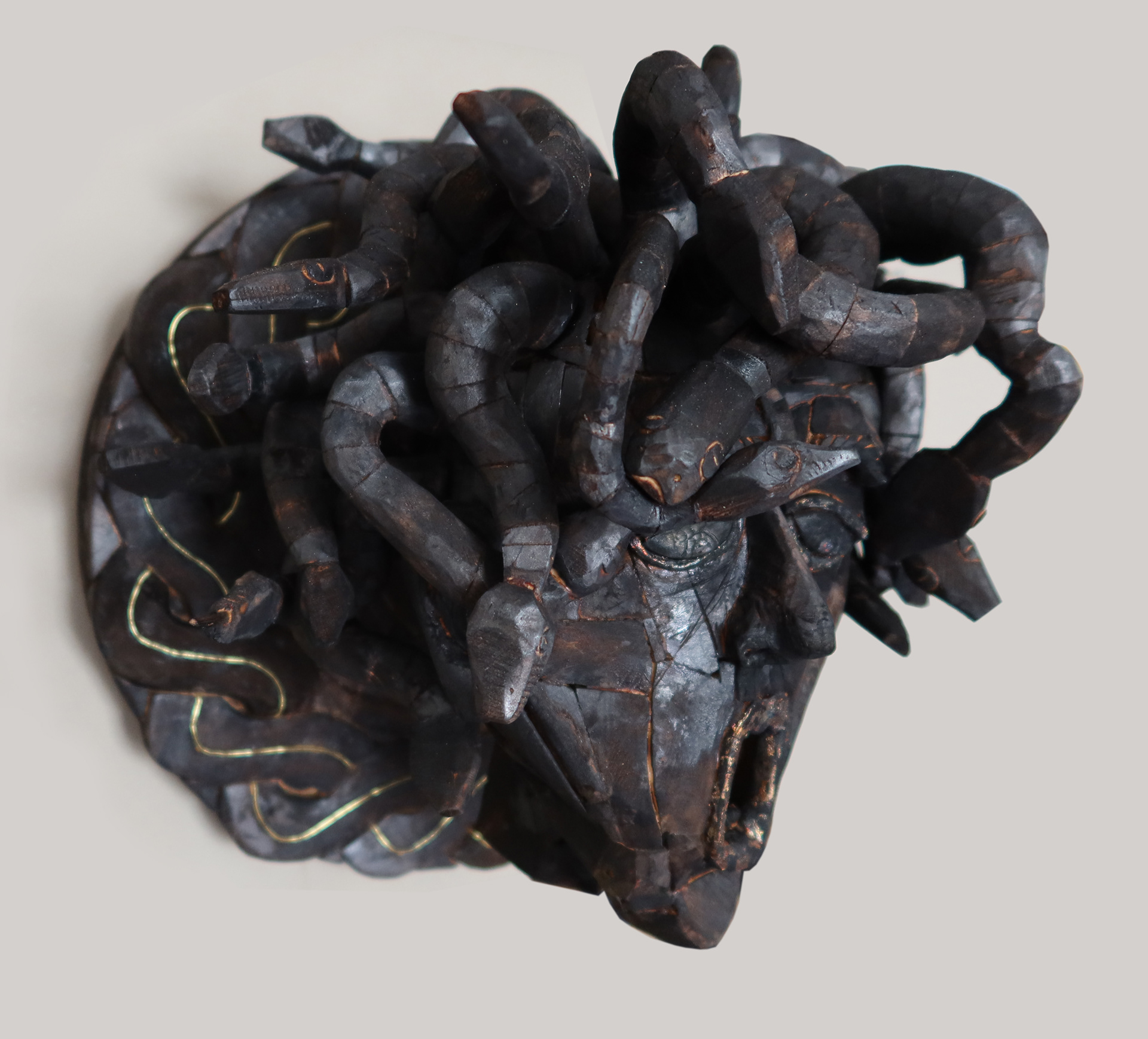 For this piece I created the head and snakes as I would normally do, by glueing individual pieces of wood together and then carving them into a smooth shape. Once it was complete I blow torched the whole lot (I removed the snakes to get a full coverage of charring). I had not done this before and I was not sure if the whole thing would fall apart. It seems to be holding together, for now.