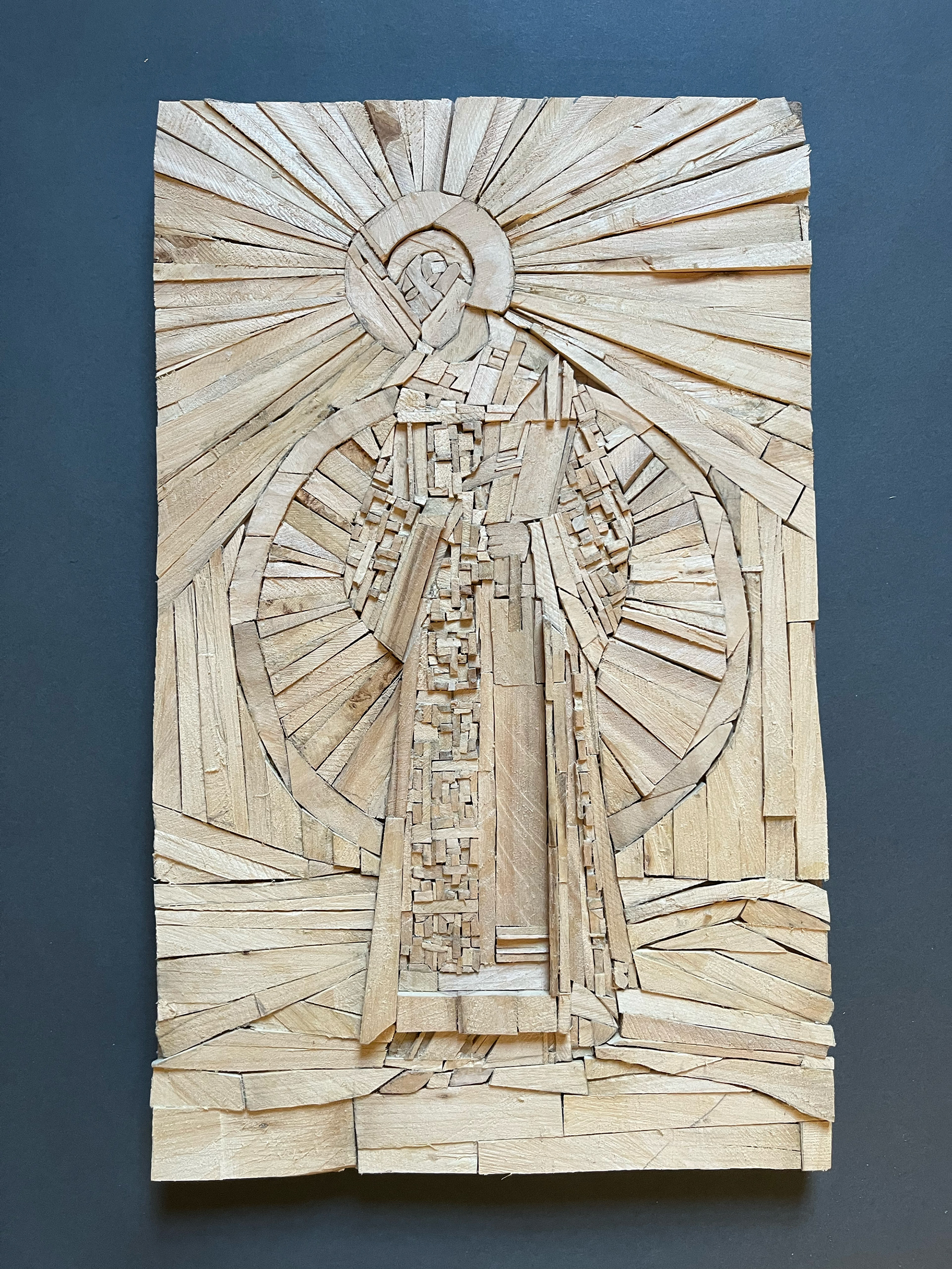 Inspired by Tarkovsky's film, Andrei Rublev and his comment "Simplicity without flourishes", this piece was based on the Russian icon painter's image of Saint John Chrysostom. His outerwear seemed like something that would be interesting to reinterpret in pieces of wood. I knew of SJC from my Tolle Legge research; apparently he had a love for St Paul that was so strong he wanted to feel his presence physically and to eat him.