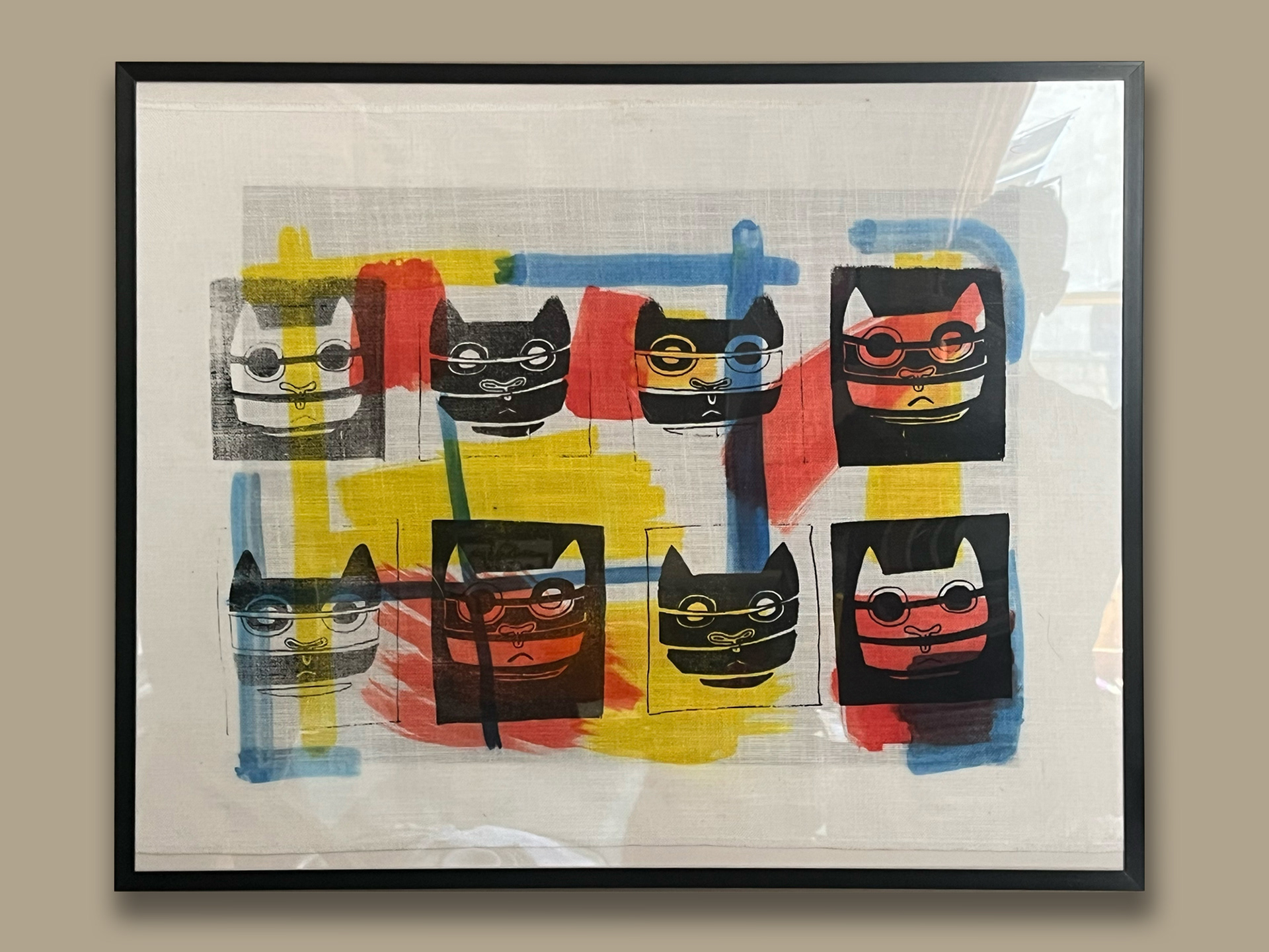 Further to the exhibition, students at Bristol School of Art went around and made tea towels inspired by the artworks on show. One student chose to be inspired by the Intermittent Cat, and I was duly sent a copy of his work, which I was very happy about.