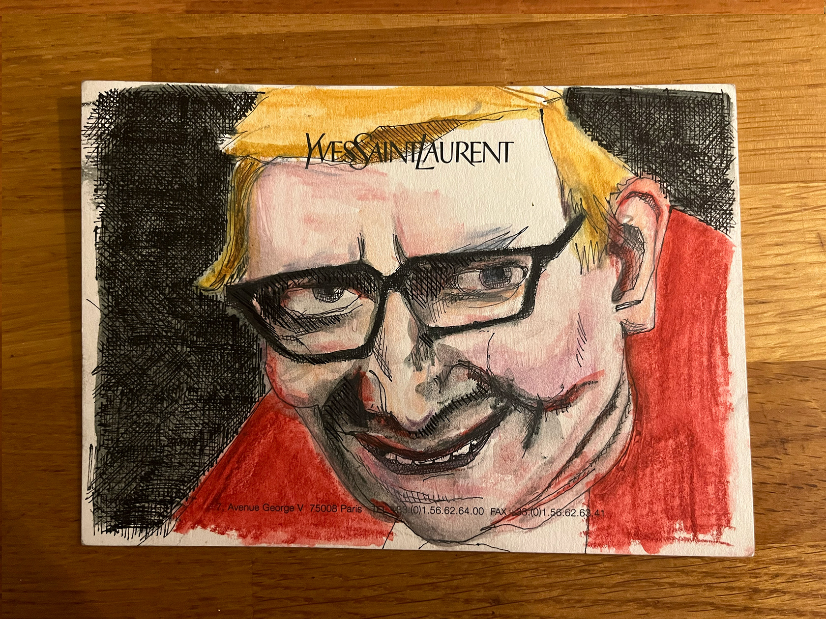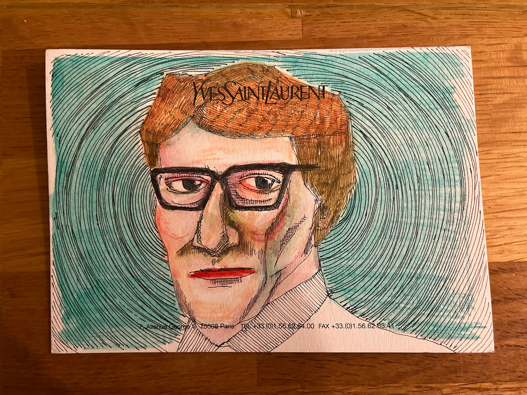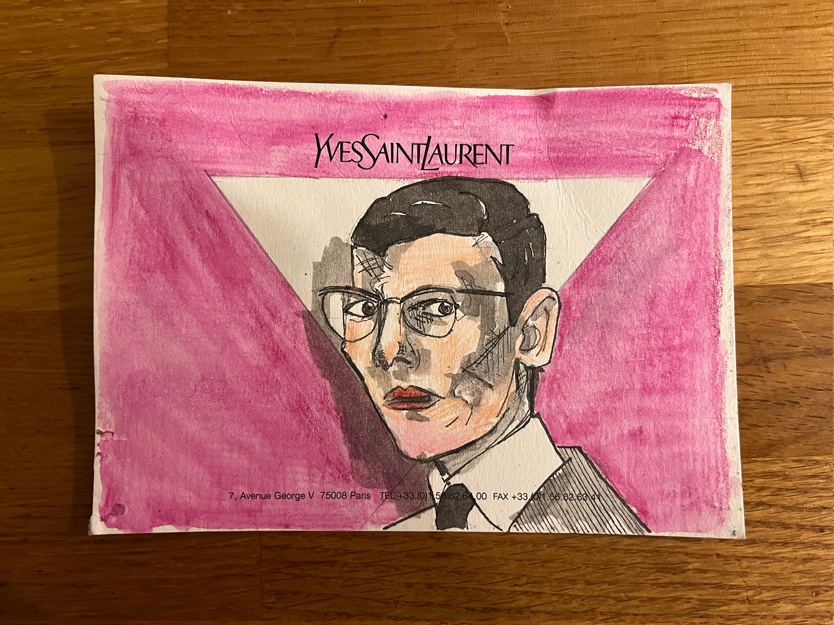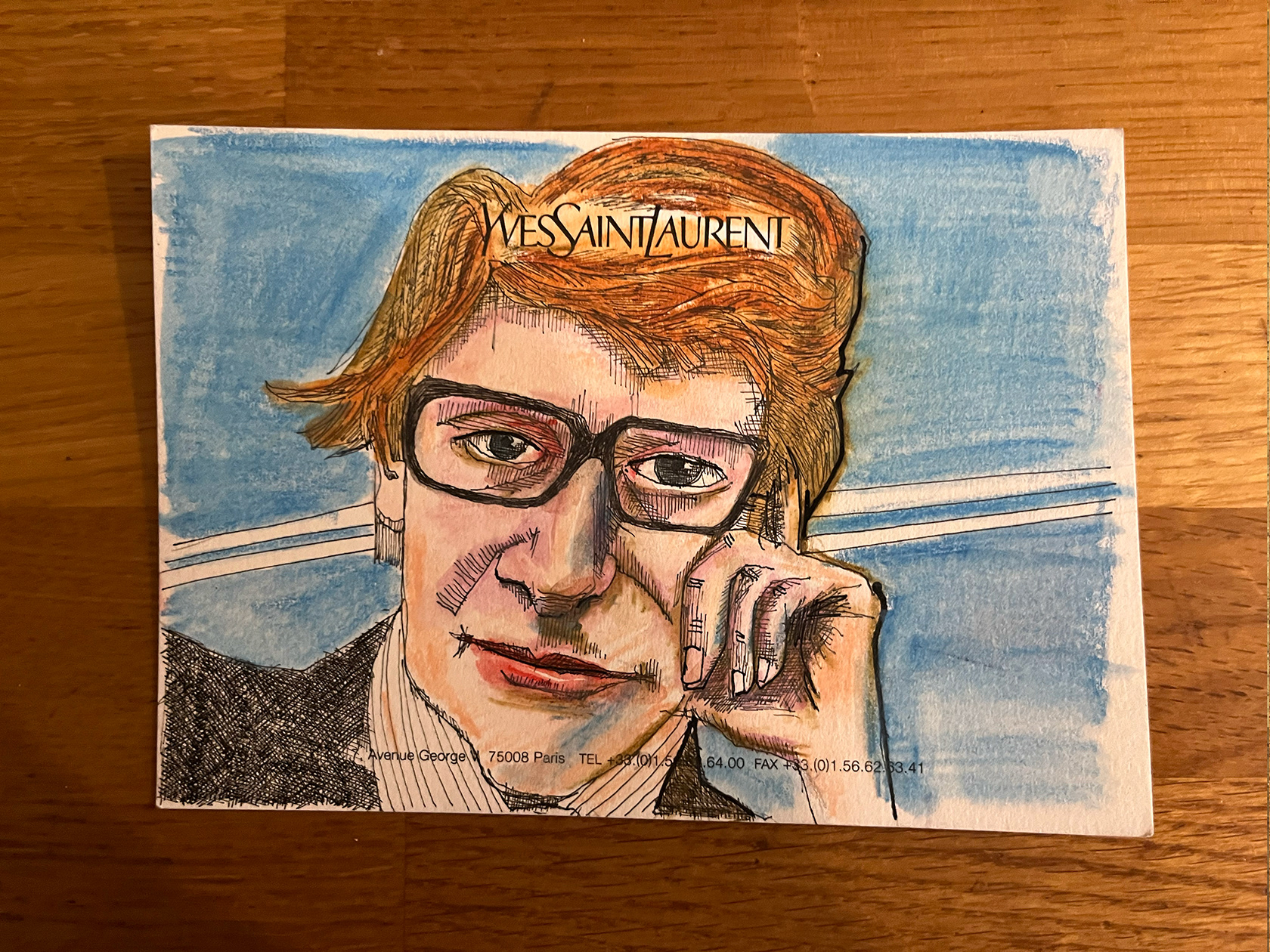 I had a number of YSL memo cards from my spell working in Luxury Goods (2001–2005). I didn't really know what to do with them, then one day I thought I would paint portraits of Yves Saint Laurent himself. There were 22 cards in the end. My friend and colleague Luca, with whom I had worked at the Corporate Image Department of the brand all those years ago was doing some illustration or a book about YSL, and I thought he might like them, so I sent them to him.