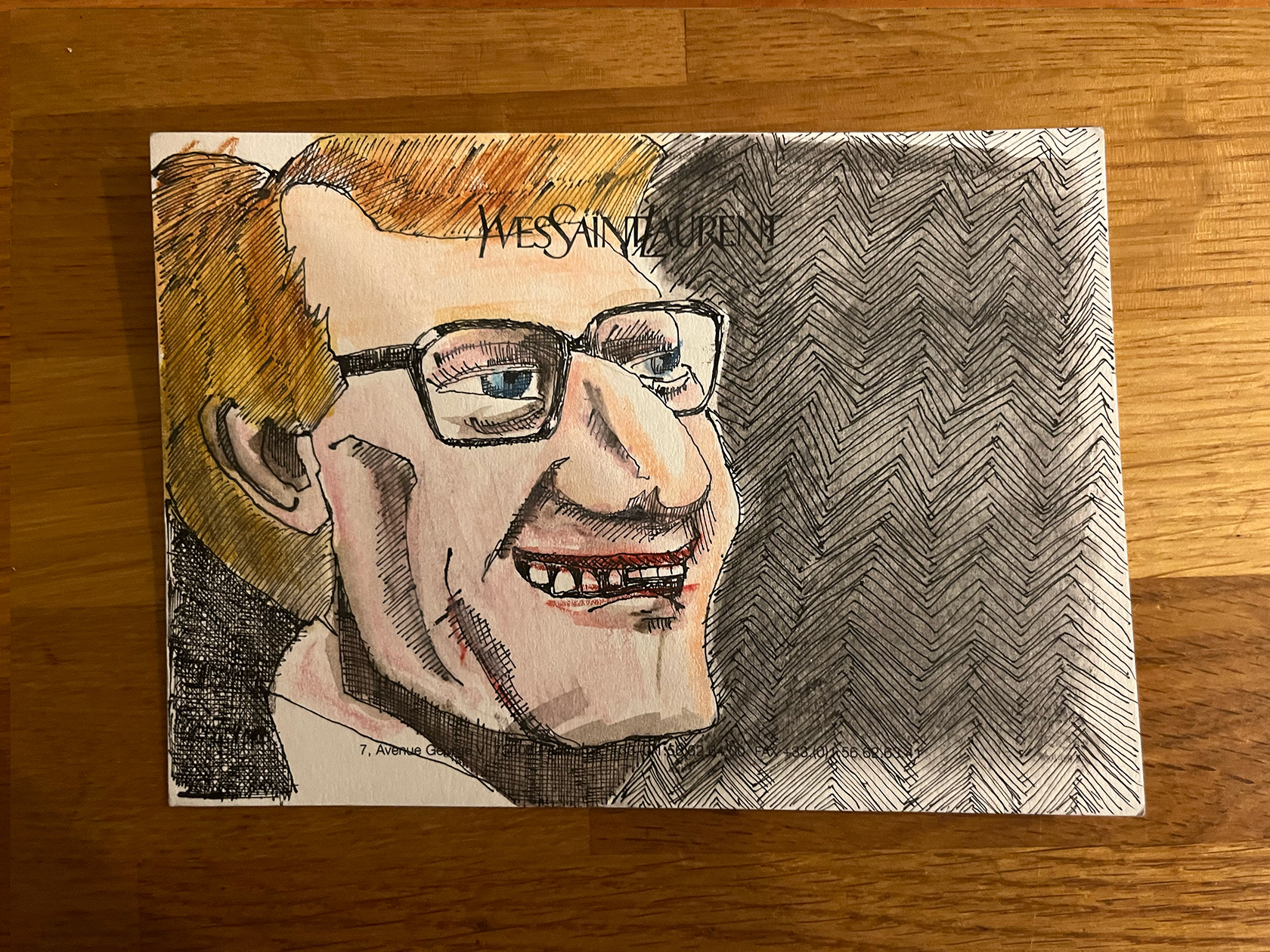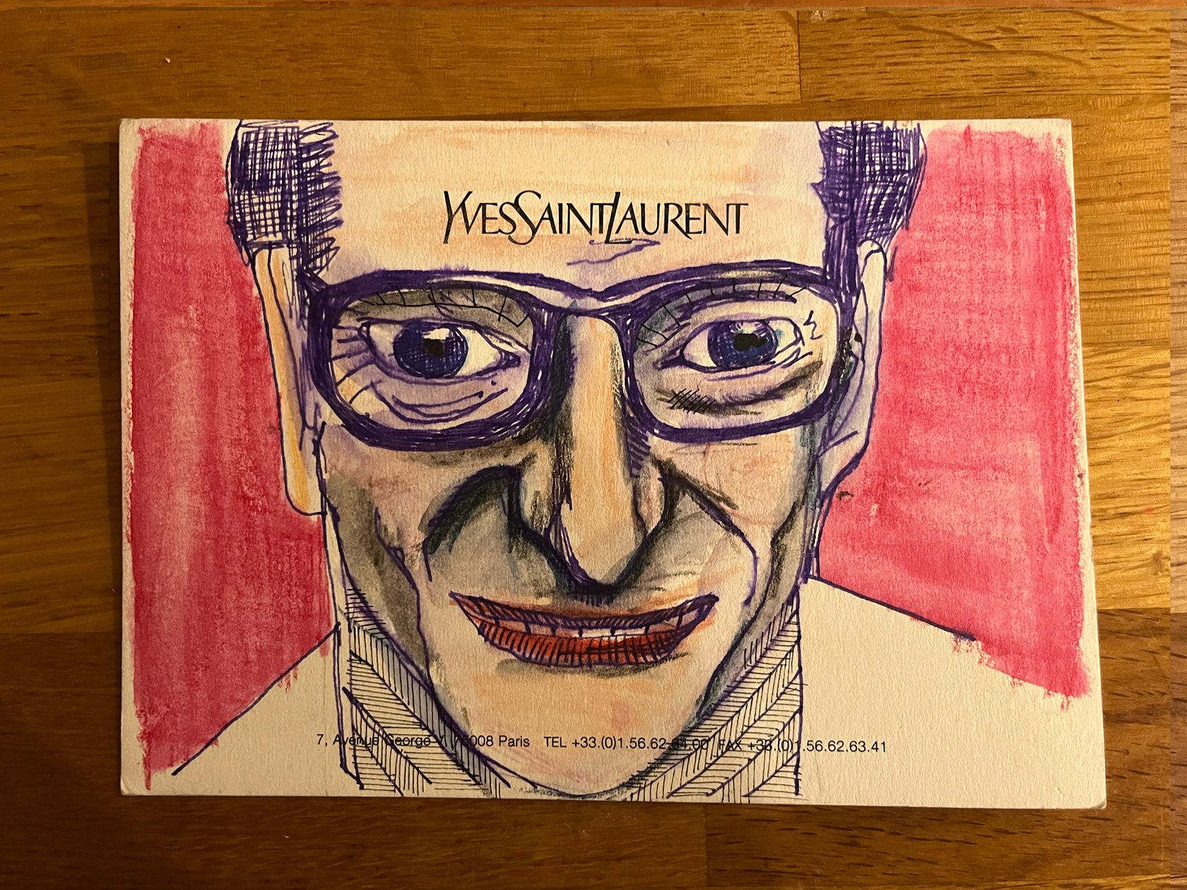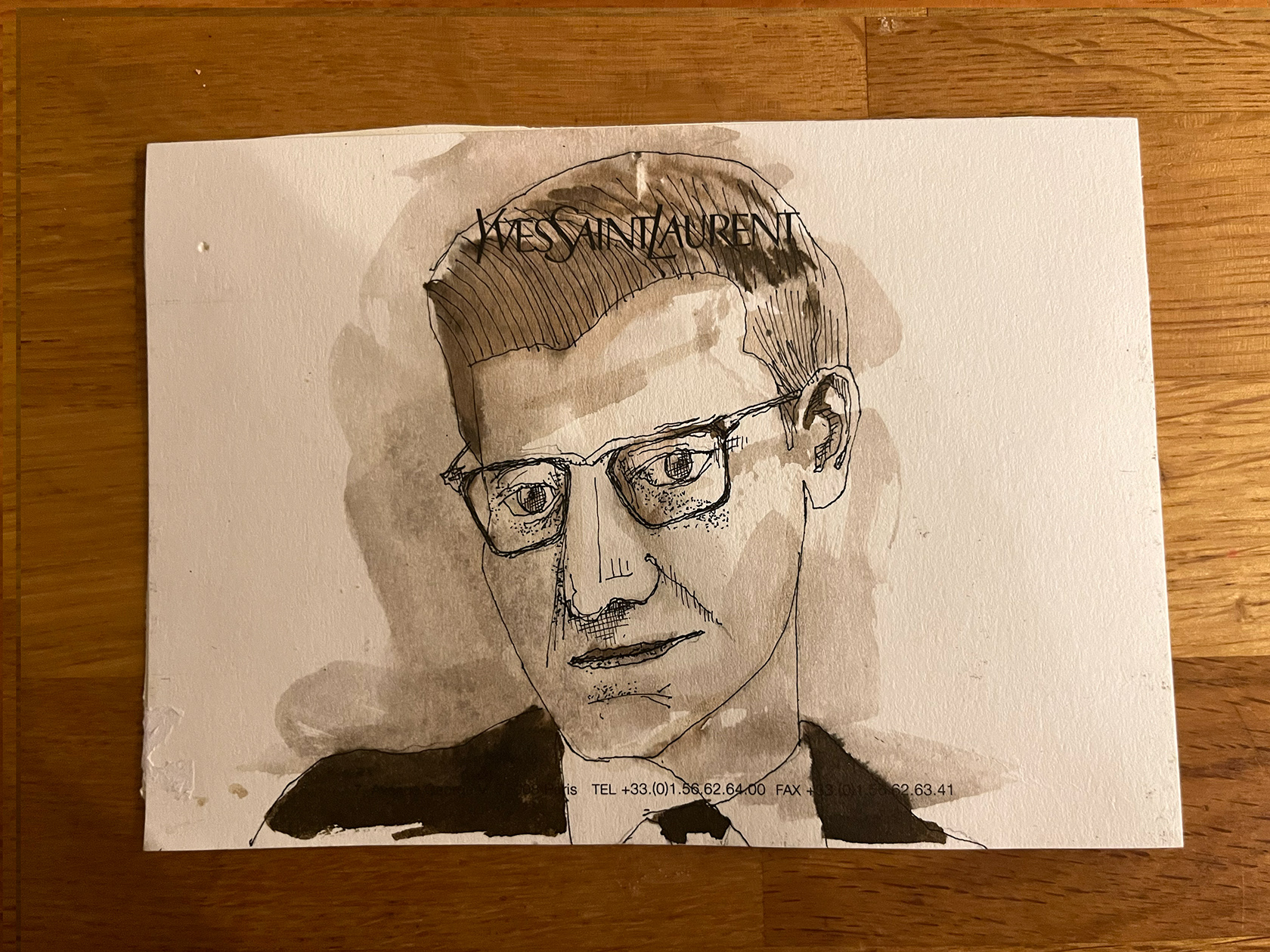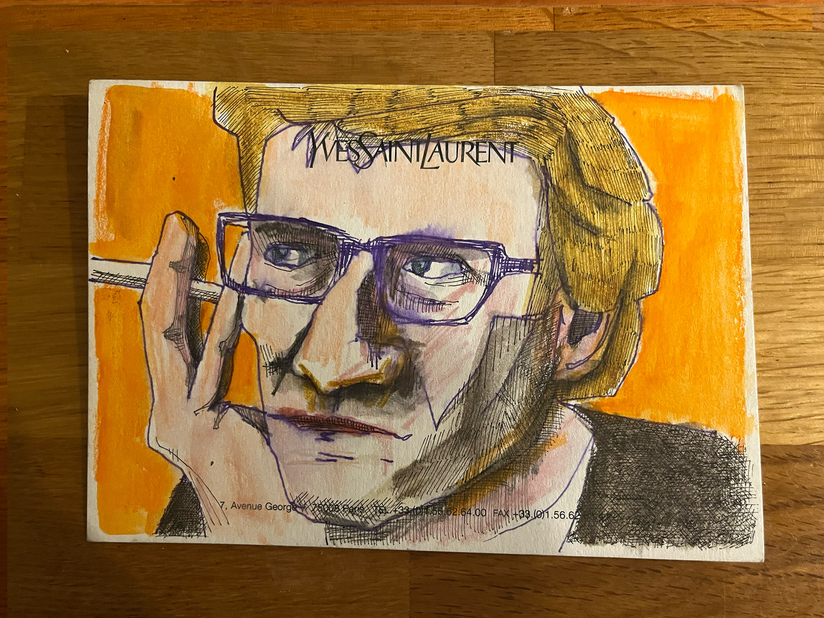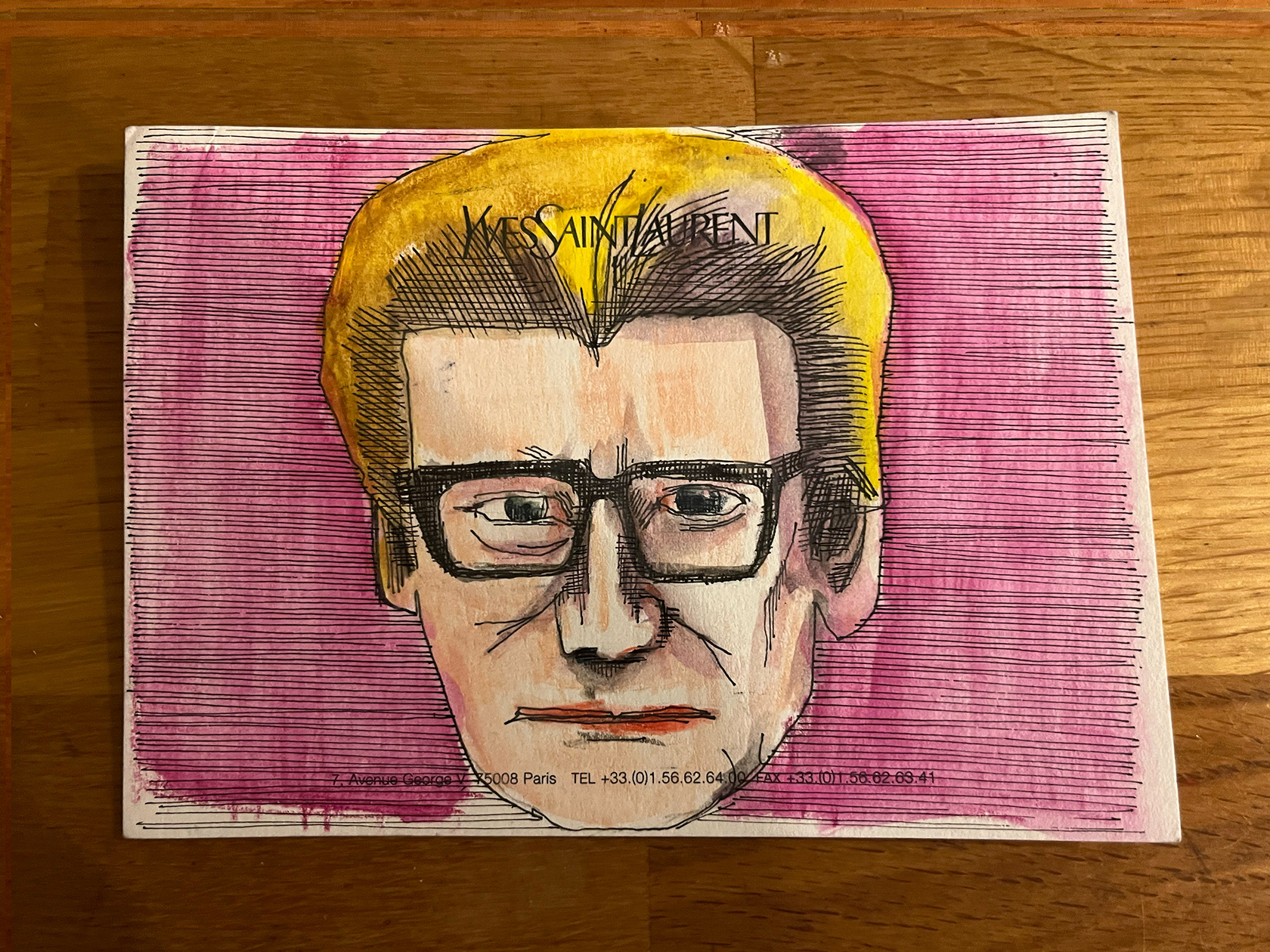 I had a number of YSL memo cards from my spell working in Luxury Goods (2001–2005). I didn't really know what to do with them, then one day I thought I would paint portraits of Yves Saint Laurent himself. There were 22 cards in the end. My friend and colleague Luca, with whom I had worked at the Corporate Image Department of the brand all those years ago was doing some illustration or a book about YSL, and I thought he might like them, so I sent them to him.