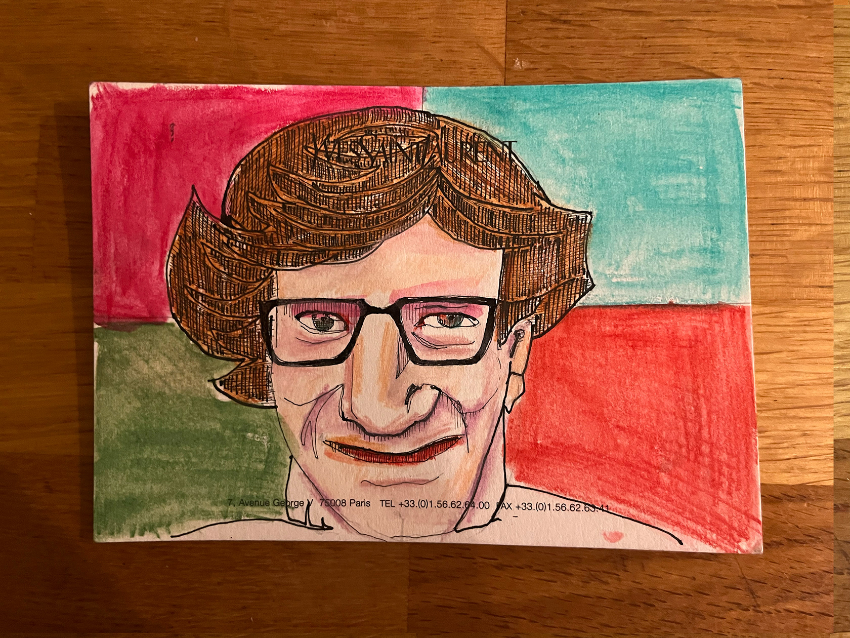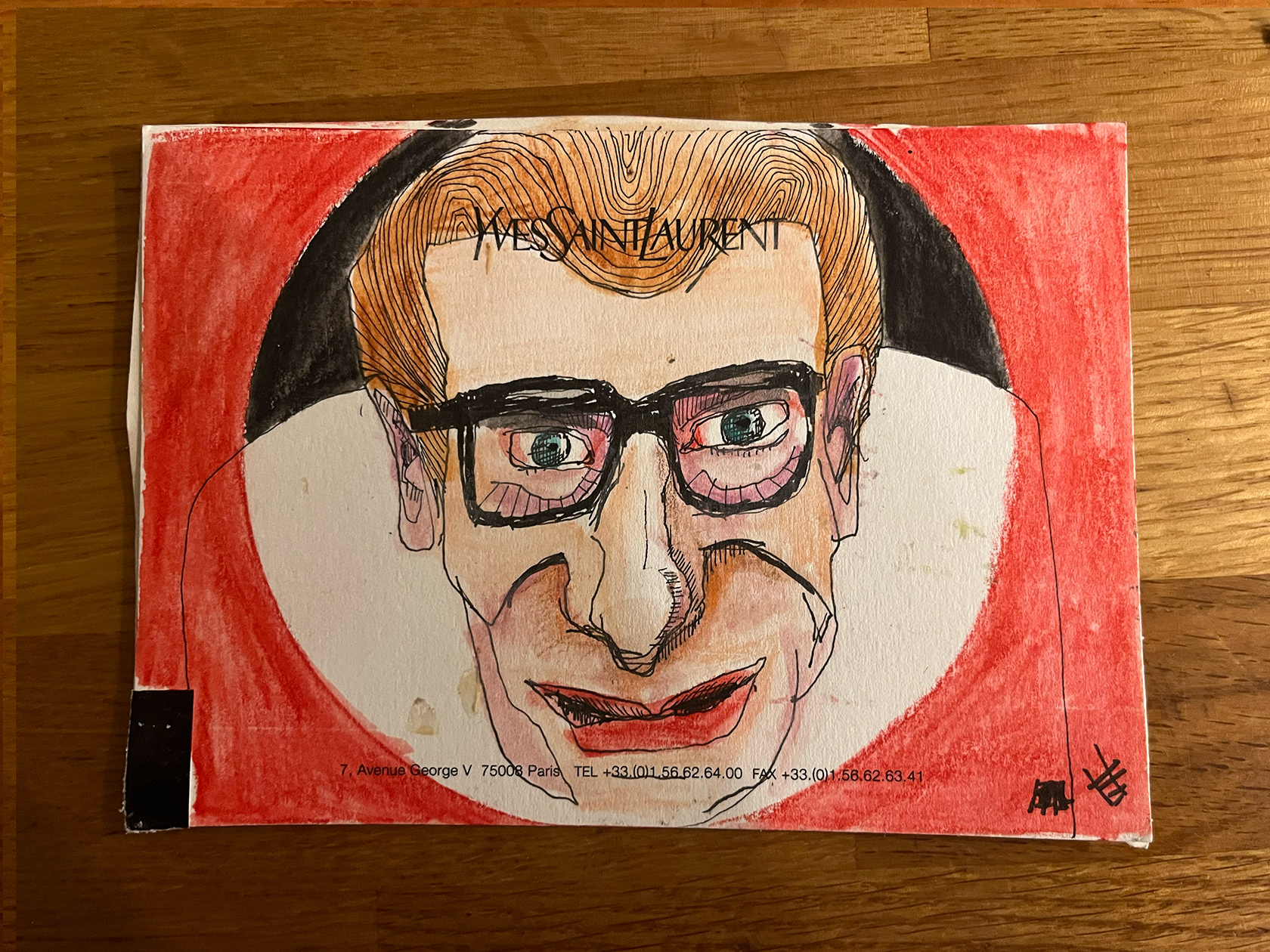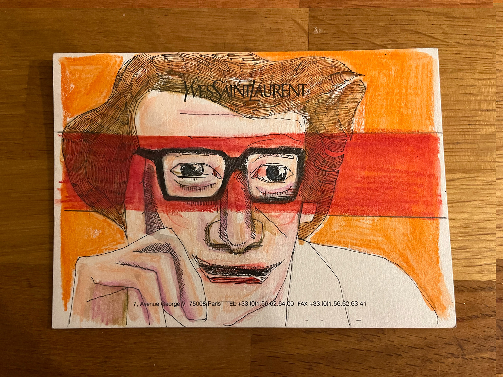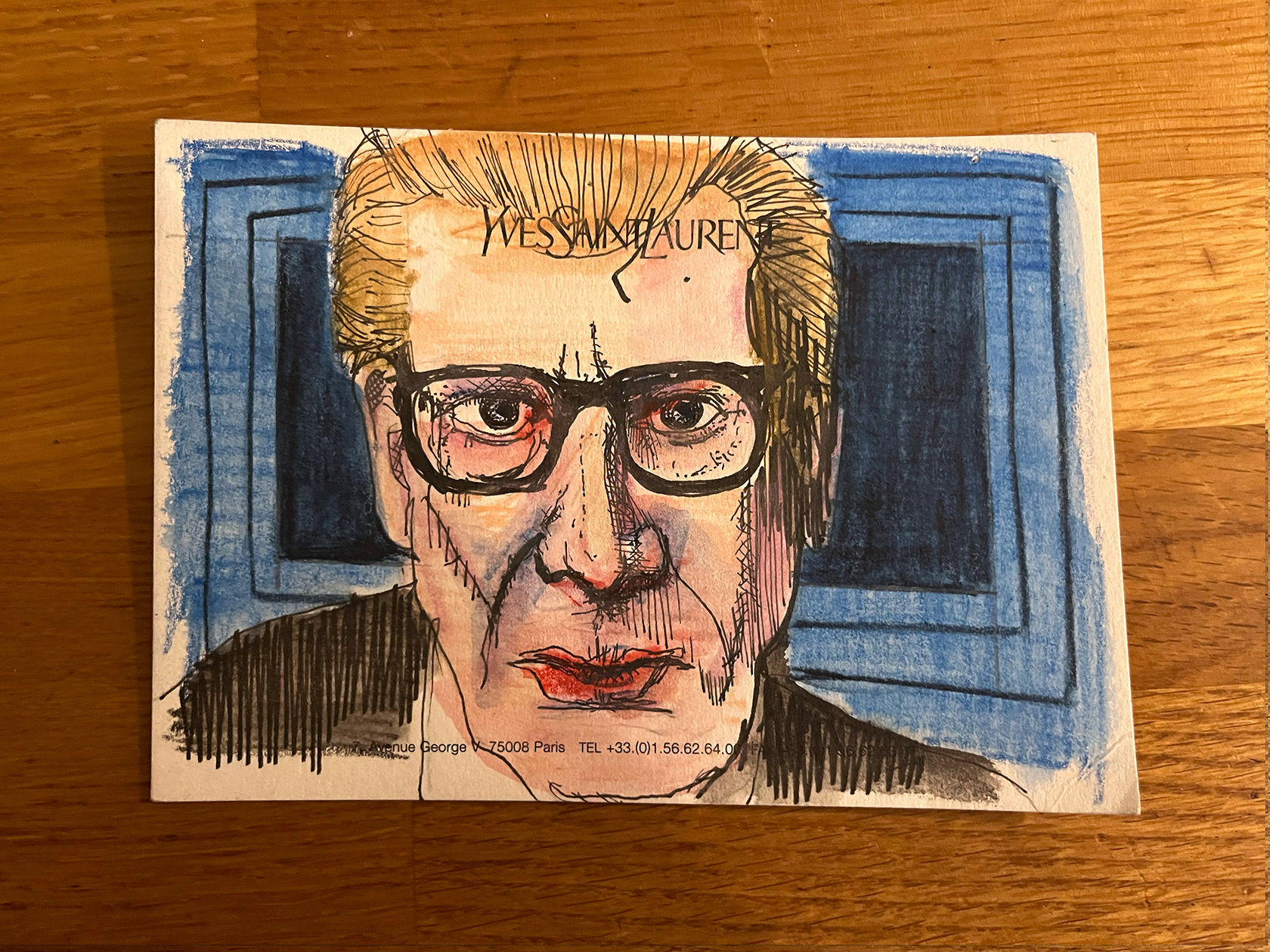 I had a number of YSL memo cards from my spell working in Luxury Goods (2001–2005). I didn't really know what to do with them, then one day I thought I would paint portraits of Yves Saint Laurent himself. There were 22 cards in the end. My friend and colleague Luca, with whom I had worked at the Corporate Image Department of the brand all those years ago was doing some illustration or a book about YSL, and I thought he might like them, so I sent them to him.