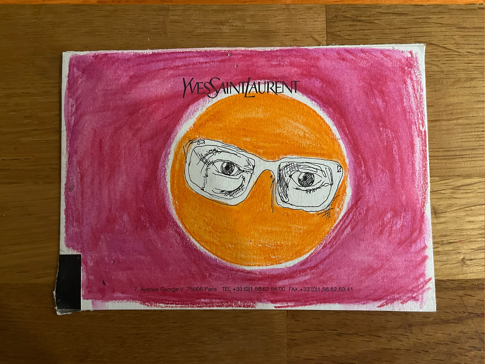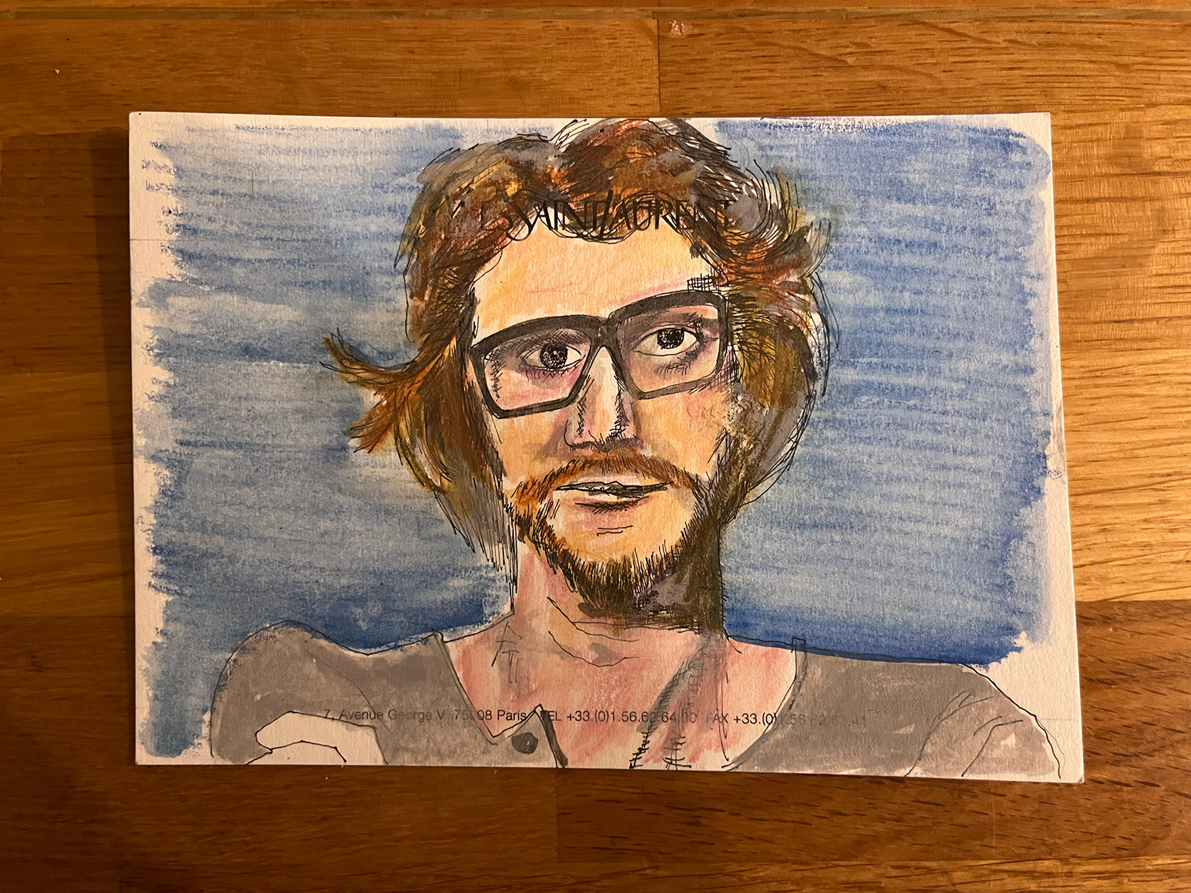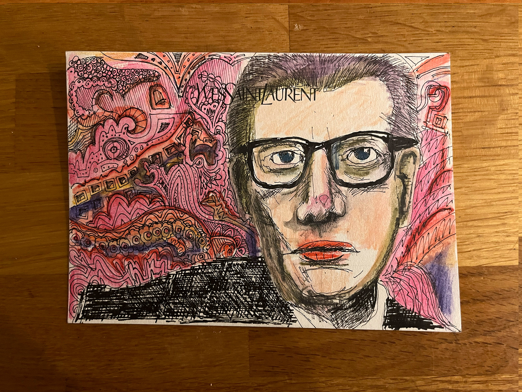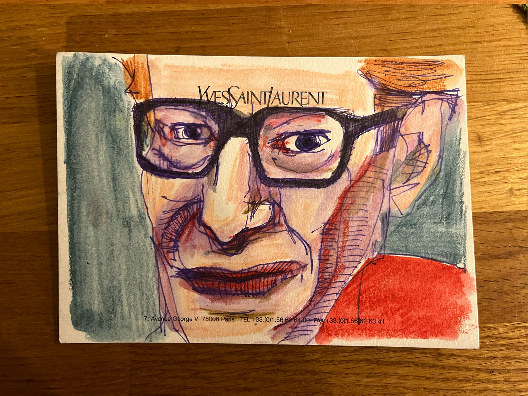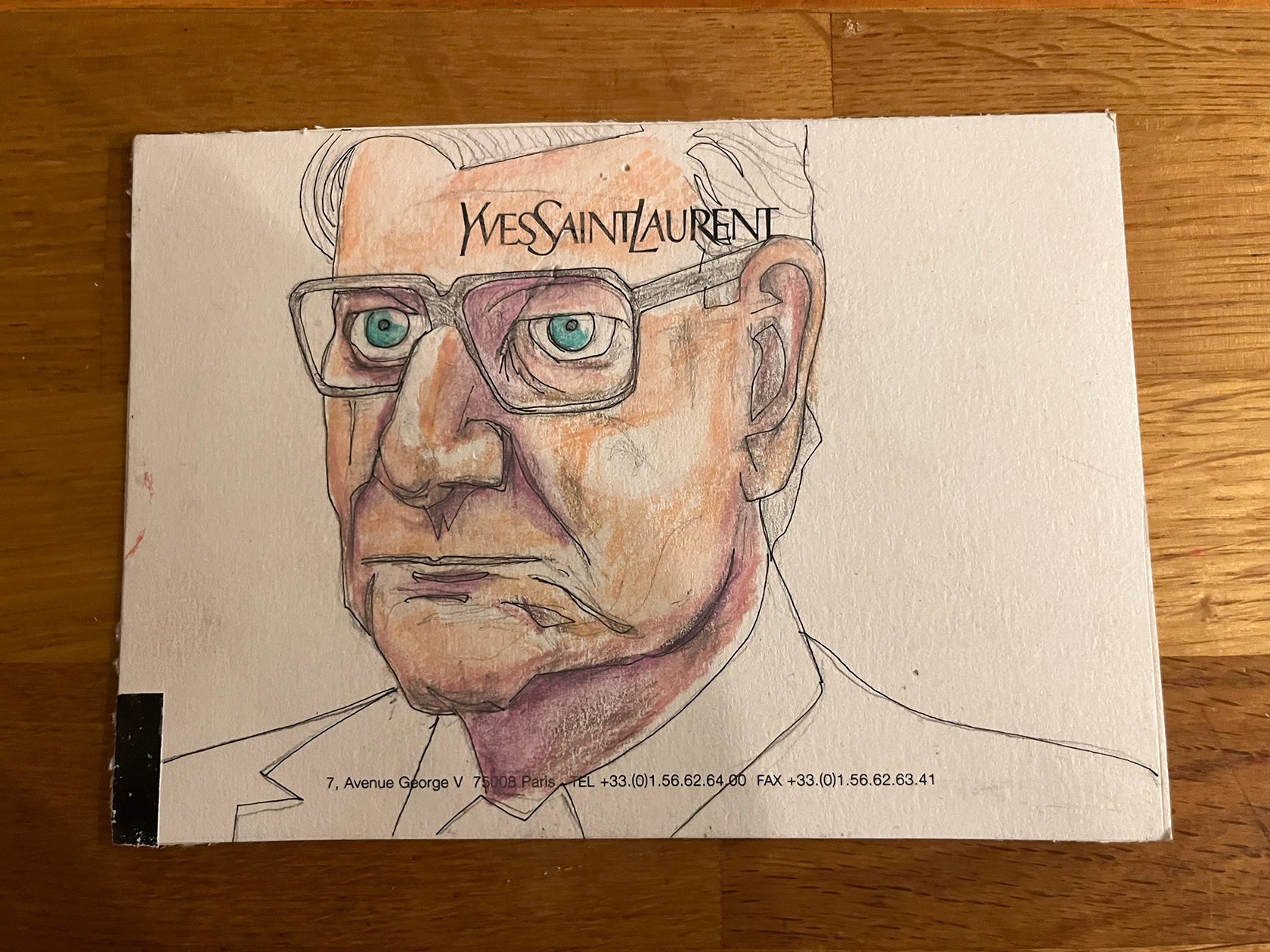 I had a number of YSL memo cards from my spell working in Luxury Goods (2001–2005). I didn't really know what to do with them, then one day I thought I would paint portraits of Yves Saint Laurent himself. There were 22 cards in the end. My friend and colleague Luca, with whom I had worked at the Corporate Image Department of the brand all those years ago was doing some illustration or a book about YSL, and I thought he might like them, so I sent them to him.